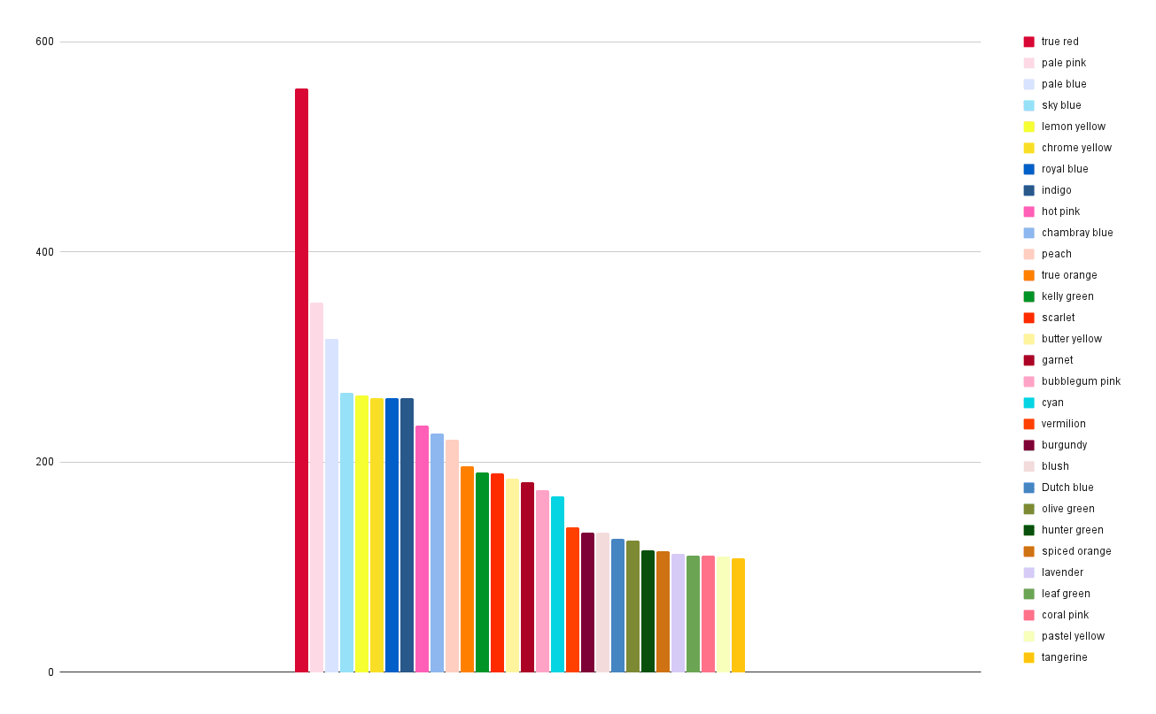 And if we look at manual scoring, there’s a fairly similar effect: red in the lead (of course), with other bold basic colors (bright yellows, royal blue, hot pink) close behind, as well as some pastels.