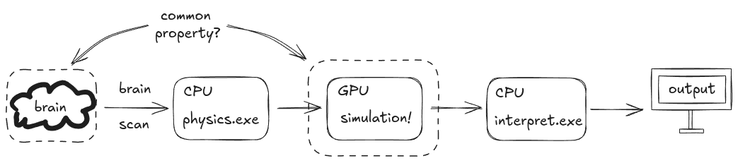 I input the readings from your brain as a big data structure in JSON format. I have an executable compiled from a program I wrote in c called physics.exe on the first compute node. The program takes in the initial conditions and simulates the quantum fields forward in time with the GPUs. The state of the quantum fields at a series of later times is stored in memory.