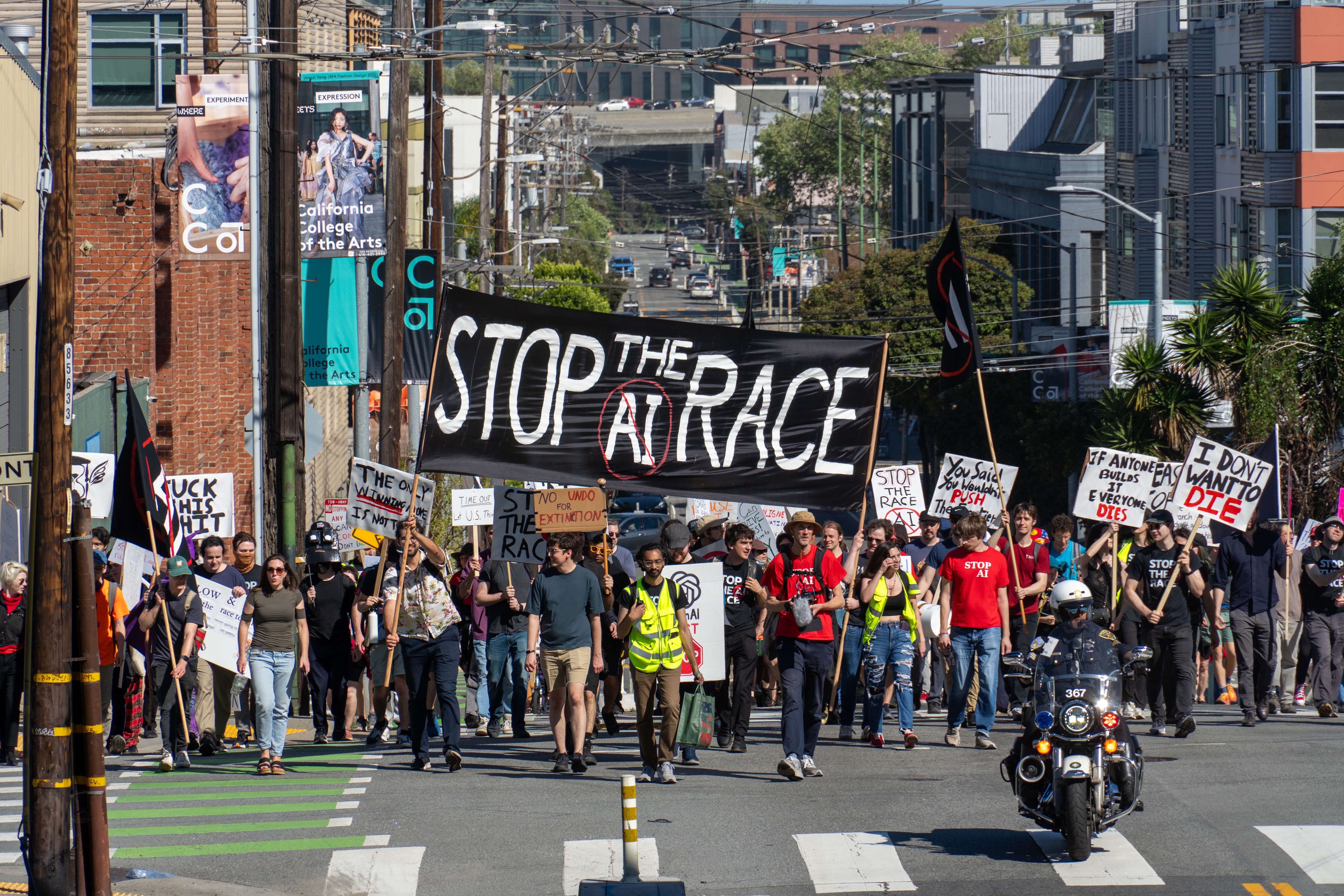 Something about the vibe was inspiring… I felt like maybe we should be doing something like that. I was there celebrating with another fifty or so people from the Stop the AI Race protest march we had just completed, along with another hundred or so others.1 We were marching, chanting, etc. to tell the AI company CEOs to say the obvious thing they should be shouting from the rooftops: “AI is moving too fast! We want to stop! If governments can solve the coordination problem we are SO THERE!”