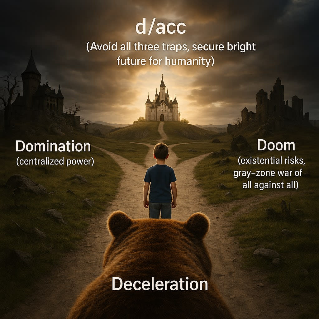 A stylized version of Vitalik Buterin’s catchy image of humanity’s current state.
