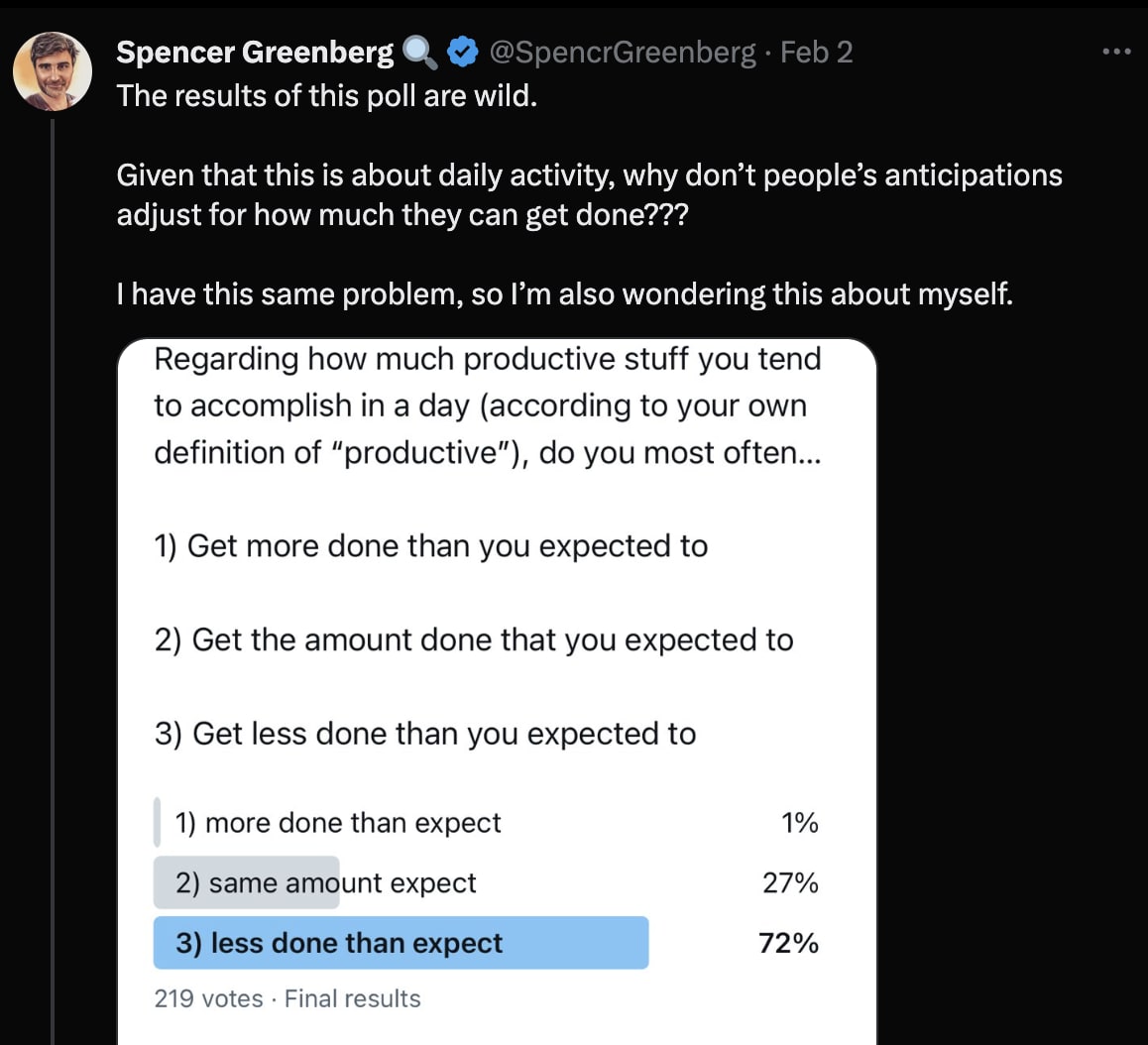 It seems to me Spencer’s confusion is due to the fact that people often do a lot of “believing in” around what they’ll get done in what time period (wisely; they are trying to coordinate many bits of themselves into a coherent set of actions), and most don’t have good concepts for distinguishing this “believing in” from prediction.