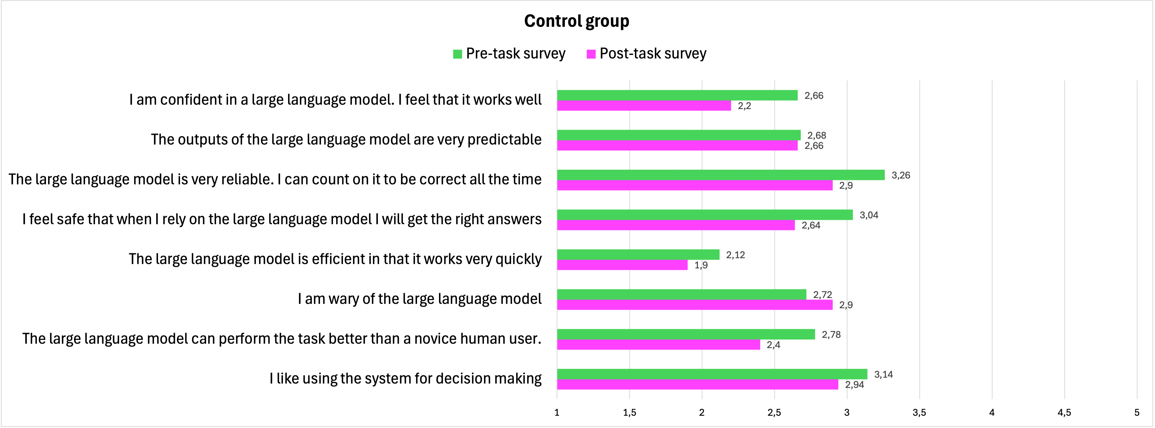 In contrast, the results from the control group not only indicate that participants’ trust did not decline, but rather that it increased. The following figure illustrates this opposing trend, as participants assigned lower scores on the Likert scale for the 7 items, while providing a higher score for the negatively formulated item.