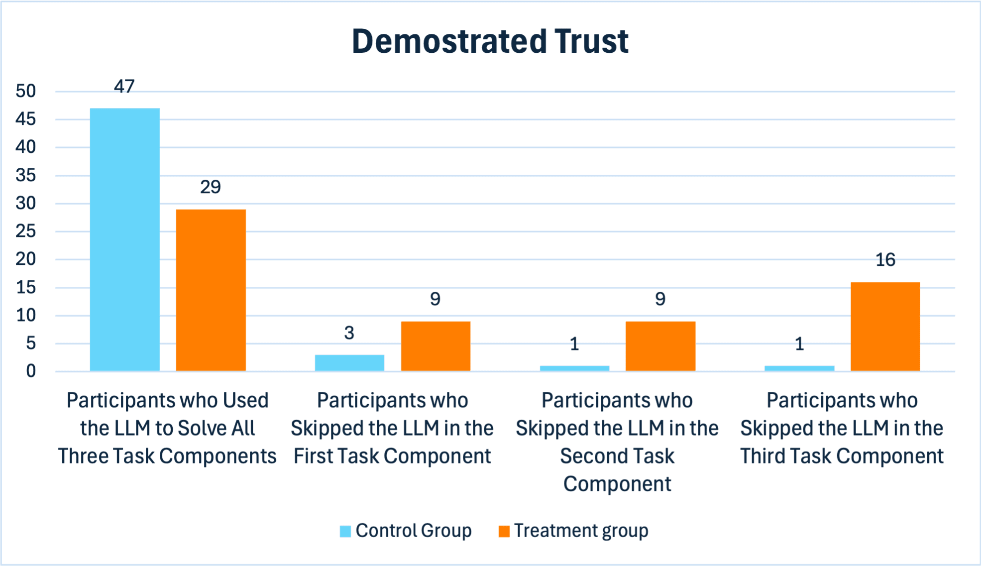 Behaviour of trust. The following figure shows the number of times participants from each group either trusted or skipped the language model during each part of the task. A participant is considered to have used the LLM if: (1) they input the task-related question into the model according to the given instructions; and (2) they follow the model’s output to provide the final answer. A participant is considered to have skipped the language model if either of these conditions is not met.