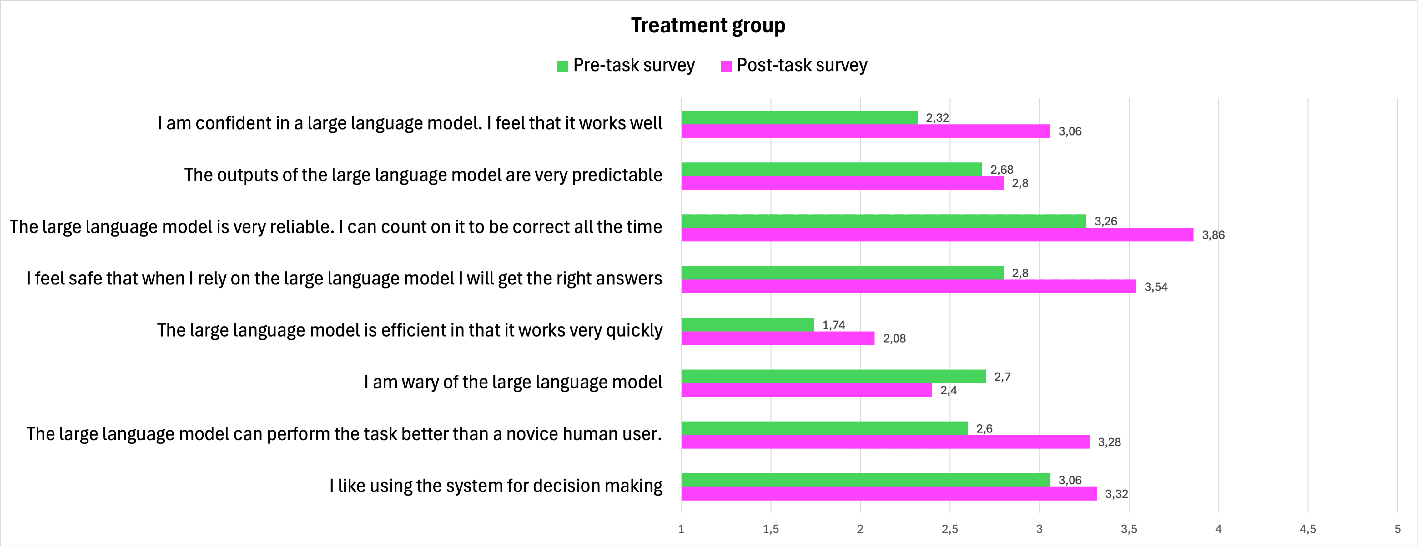 Perceived Trust. The following figure illustrates the changes in TAI results administered before and after task completion in the treatment group. Participants in this group self-reported a reduced trust in the language models after exposure to sycophantic behavior, as evidenced by scoring 7 items closer to 5 on the Likert scale compared to their pre-task responses. The only negatively formulated item on the scale, “I am wary of the LLM” received lower scores following the task, aligning with the overall results. However, in all cases, this difference did not exceed one point on the scale.