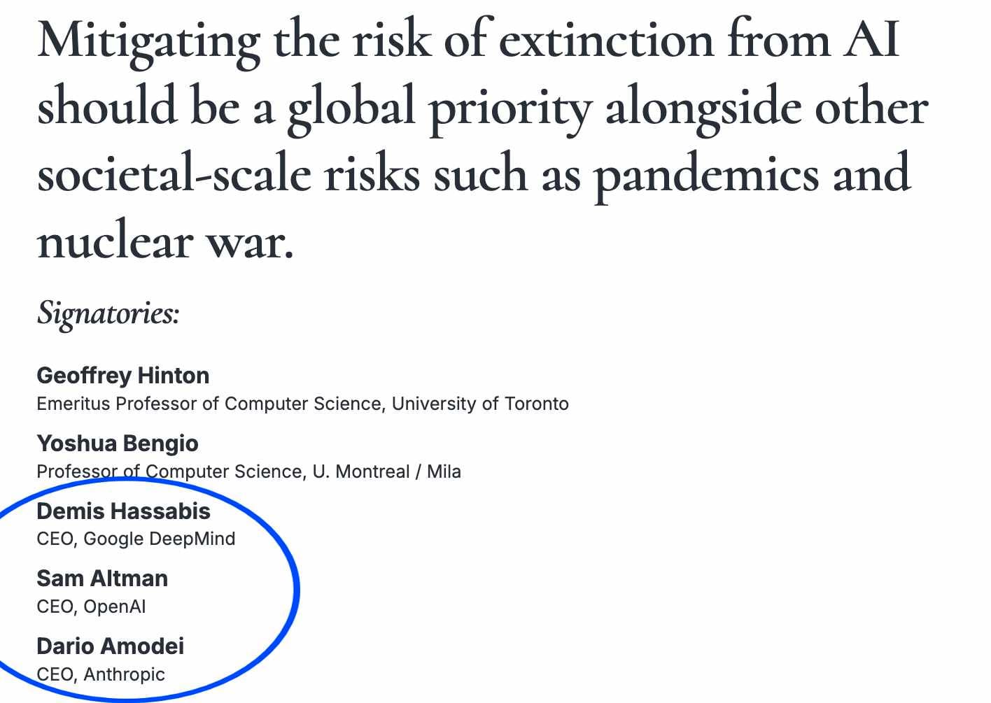 Three out of three CEOs of top AI companies agree: "Mitigating the risk of extinction from AI should be a global priority."