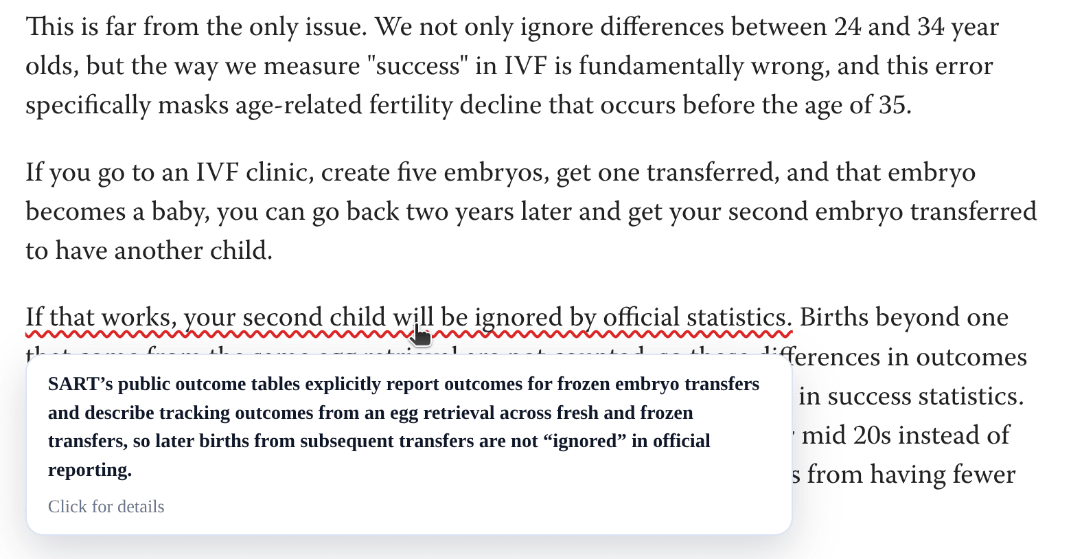 If that works, your second child will be ignored by official statistics. Births beyond one that come from the same egg retrieval are not counted, so these differences in outcomes that come from having many viable embryos literally don't show up in success statistics. This practice specifically masks the benefits of freezing eggs in your mid 20s instead of mid 30s, because most of the decline between those two ages comes from having fewer viable embryos.