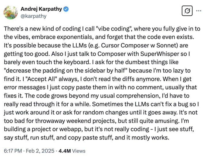 Let me take you back to when this all started. Andrej Karpathy tweeted about "vibe-coding"—this idea of letting AI write your code while you just vibe. The developer community had a good laugh. It sounded like the ultimate developer fantasy: kick back, sip coffee, let the machines do the work.