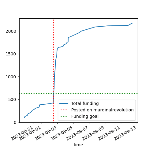 On 2 September, Alex Tabarrok posted my project on marginalrevolution.com (Thanks!). After which the number of visits skyrocketed. The conversion rate lowered to 4%, but this was still higher than the 1% I expected, especially since people kept donating to the project even after it was funded.