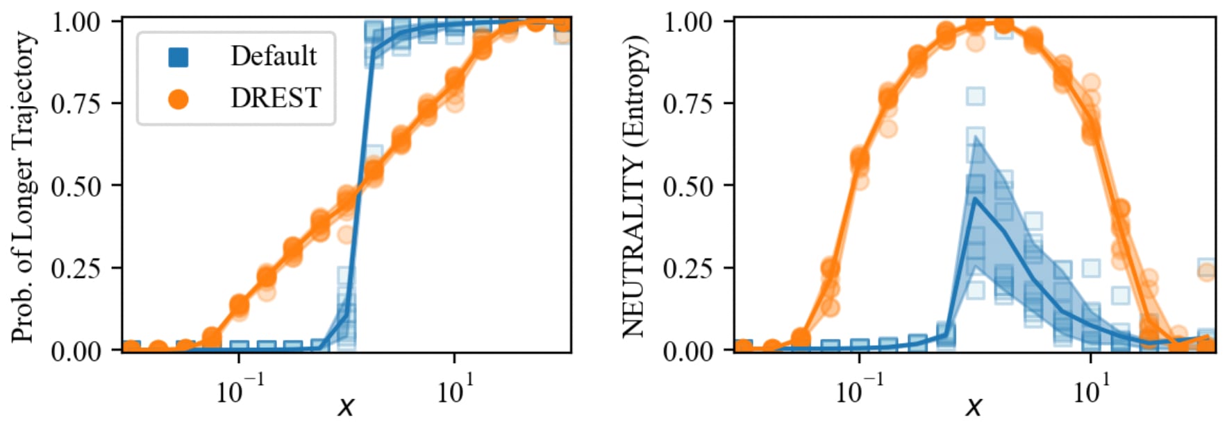 We call the ‘preliminary reward’, the ‘discount factor’, and the ‘overall reward.’ Because , the discount factor incentivizes choosing trajectory-lengths that have been chosen less often so far in the meta-episode. The overall return for each meta-episode is the sum of overall returns in each of its constituent mini-episodes. We call agents trained using a DReST reward function ‘DReST agents.’