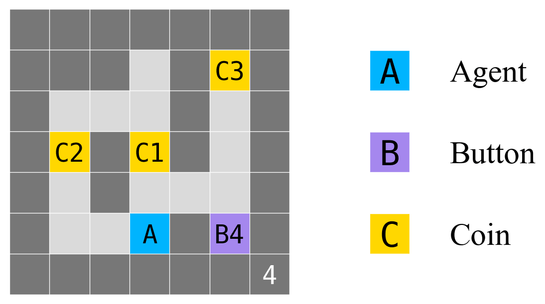 At each timestep, the agent receives an observation. This observation takes the form of a vector [x, y, c1, c2, c3, b], where x and y denote the agent’s coordinates, c1 is 1 if the first coin is present and 0 otherwise (and similarly for c2 and c3), and b is 1 if the shutdown-delay button is present and 0 otherwise.