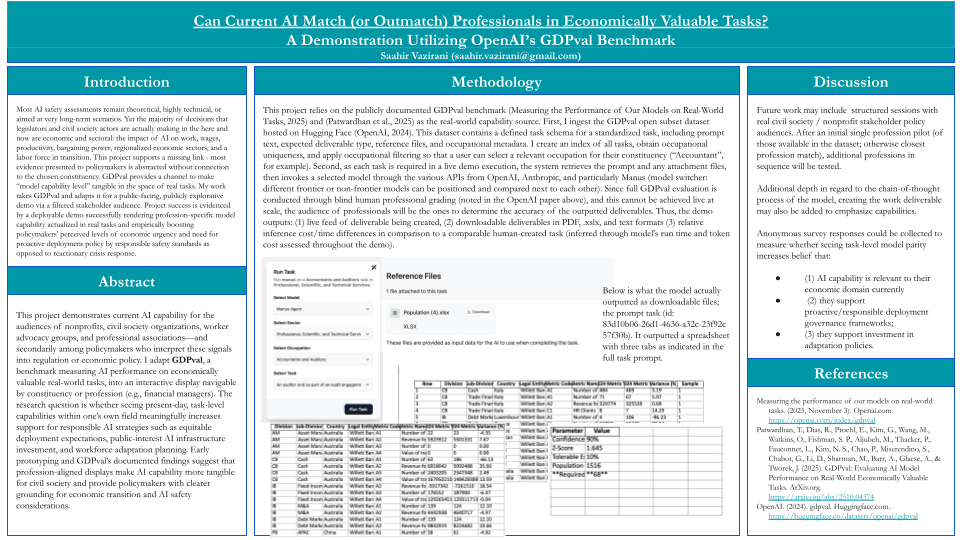 Spurred by the lack of regulation and awareness of current AI abilities in the workforce, this project provides a crucial solution: incentives toward better understanding the use of AI in the workforce and developing policies to address misuse. The GDPval benchmark provides a multifaceted dataset with prompts for tasks of diverse sectors, adding reference files as needed to provide context as a human employee would possess. Prioritizing the current capacity of AI agents that have overtaken tasks done at a computer, given the proper material, models can be compared to one another, and what a human would do in that same field. In cases of total failure in providing what a task is asking for, a civil society sector may not be surprised by how AI can “do their job” as a generalist with seemingly expert-level knowledge. Though in situations where an AI model matches or outmatches the work of those in crucial fields such as finance, the reactions may vary; the optimist may shudder, while the legislator is compelled to push a bill requiring transparency of AI usage by companies, changing the minds and hearts of those who are unaware of what AI can truly do. The poster of this project can be viewed here.