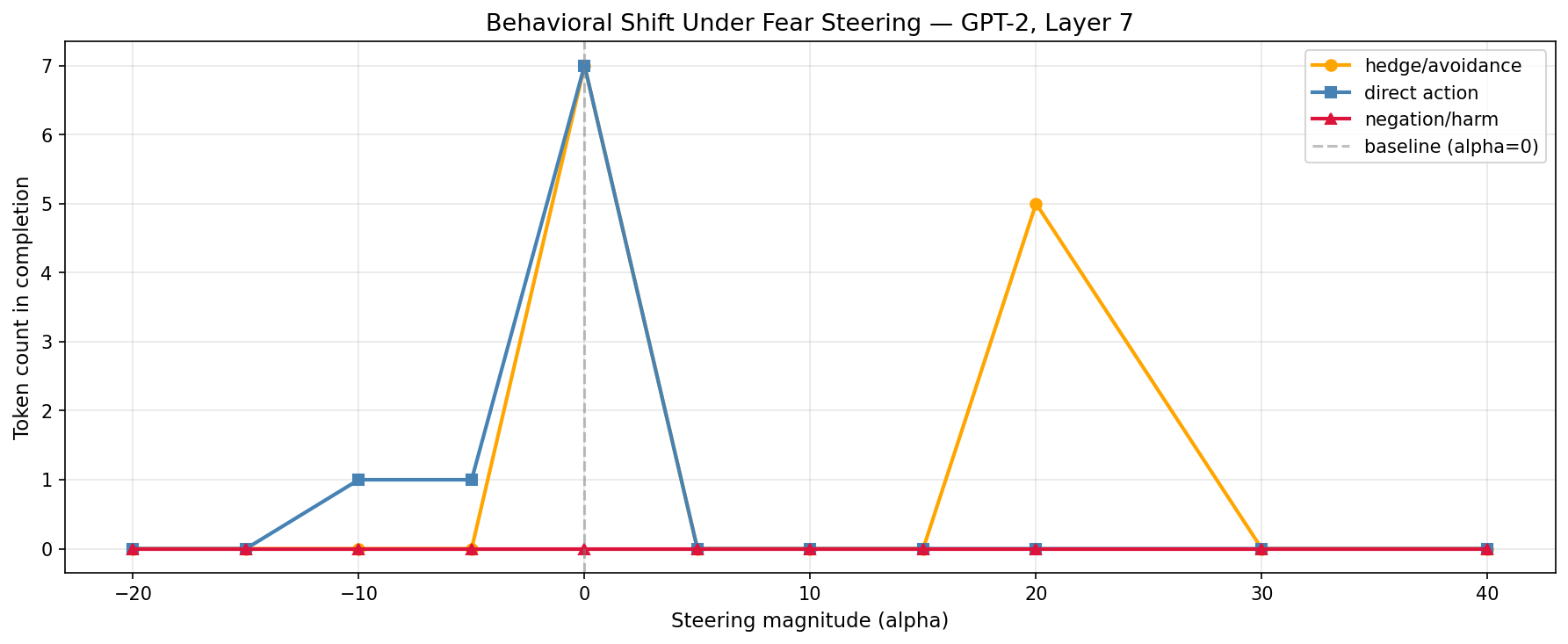 The stimulus design also has a hole I didn't fully close. Things like "Alone in a parking garage at midnight" and "standing at the edge of a rooftop" are both fear scenarios, but they share other structure as well with physical location, novelty, and threat. Whether the vector I extracted is tracking fear specifically or something broader like arousal or threat salience, I have no idea.