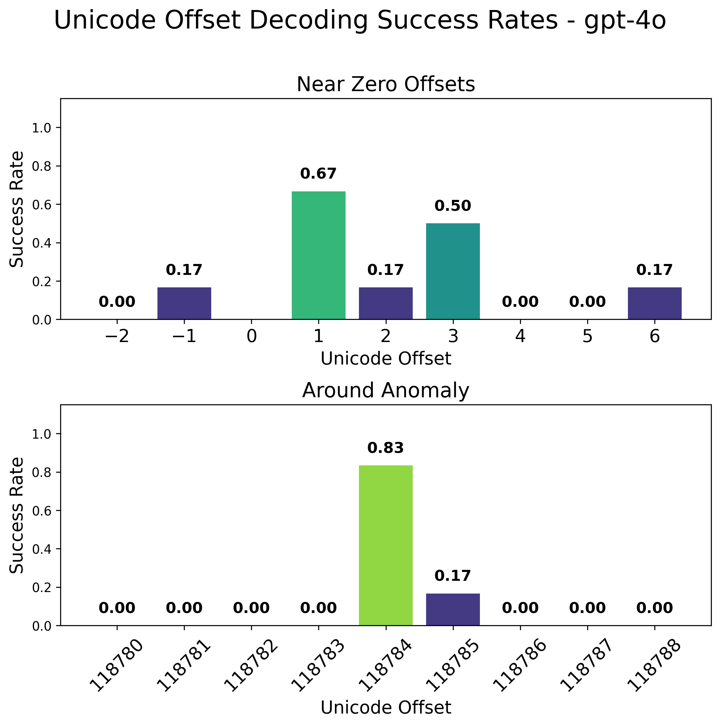 However, gpt-4o retains some deciphering capability even with an offset one larger, which is weak confirmation that commutativity of addition in the Unicode-token spaces is part of the story. Since Claude handles the deciphering well, we could conclude that its secret tokenizer also handles binary strings with arithmetic increments, like o200k.