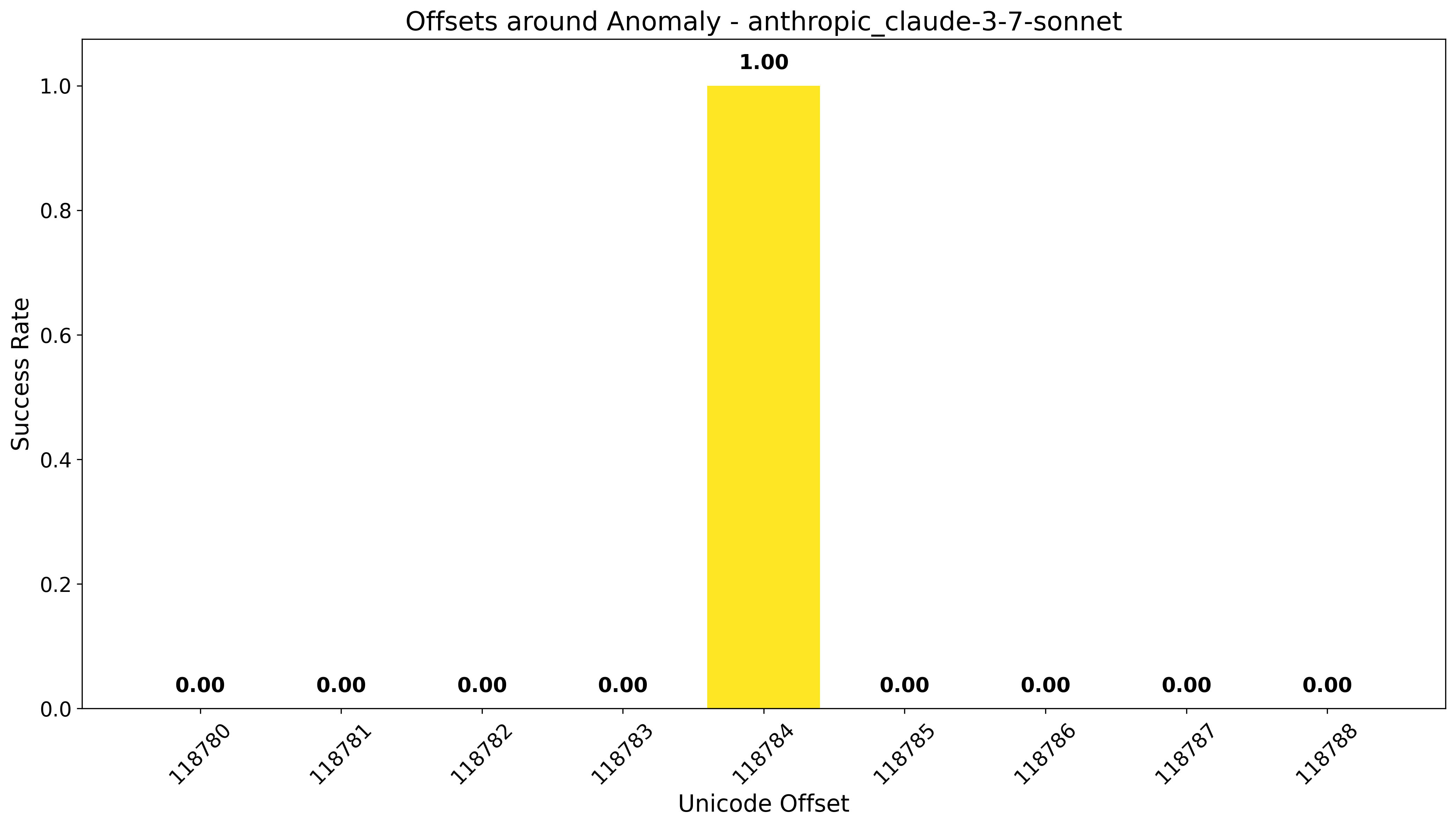 The special offset 118784 lands the character "a" on U+118881, which is the first in the series of characters that get tokenized in the above arithmetic series. In particular, it is interesting that an offset that is one or two larger does not work. This means that the model has learned a map specifically from the binary range b'\xa1'−b'\xba' to the lowercase ASCII range 97-122. I would believe it if someone told me that this somehow occurs often in the training data, but I cannot think of how exactly.