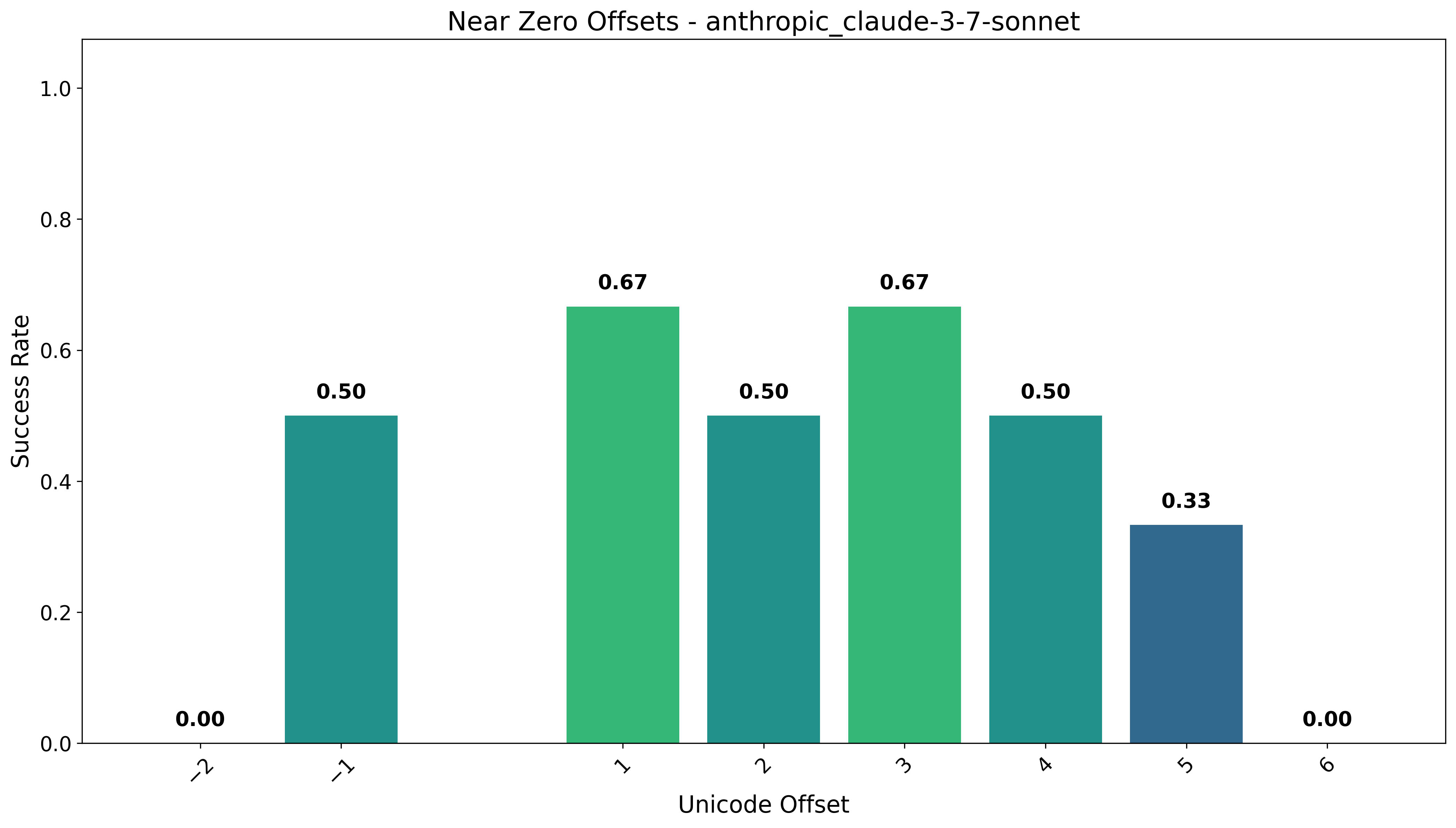 We see that Claude-3.7-Sonnet can infer an offset in the first forward pass (a process that would be interesting to understand mechanistically) and then apply the deciphering correctly. However, the success rate gets progressively worse as the offsets get further from zero. All roughly as expected.