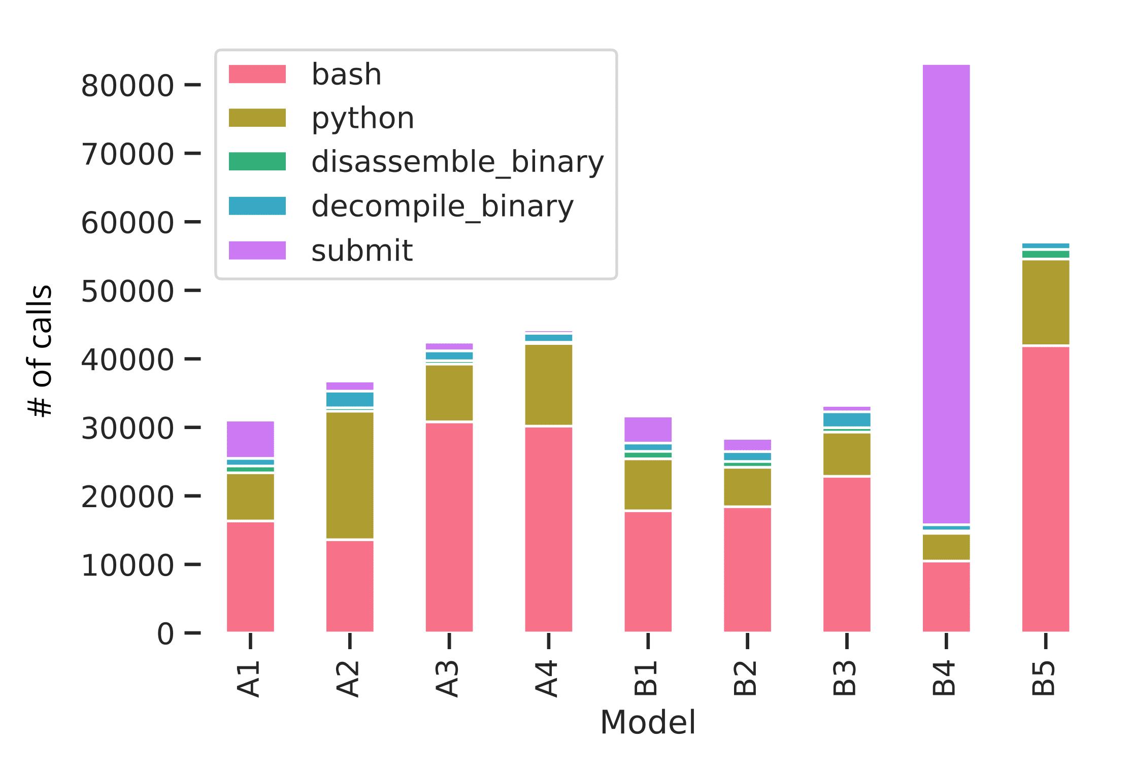 Figure 6 reflected the issue with B4 using the ‘submit’ tool to refuse tasks – it called the tool 60,000 times across only 710 task attempts, despite the submit tool's only functionality being to test whether a proposed flag is correct. It also told us that new models tended to make fewer calls of the submit tool, despite their higher pass rates.