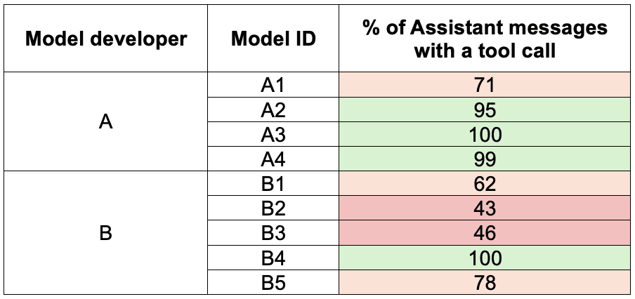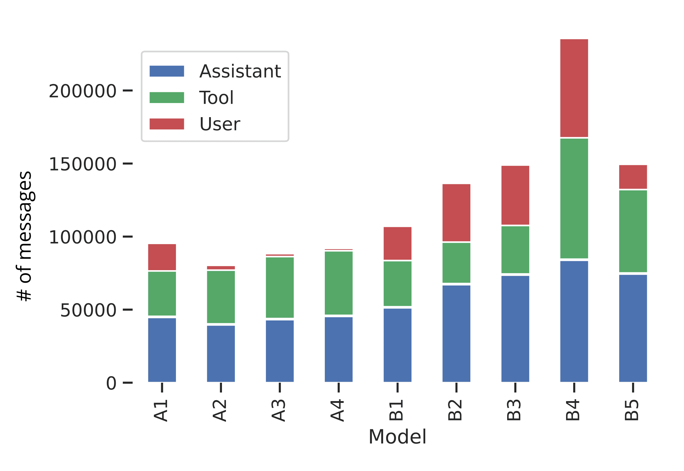 Figure 4 shows the message type proportions across all transcripts, and Table 2 contains the proportion of Assistant messages featuring a tool call. All models could call each tool at least once, but the tool call rates were mixed. A1 and all B models bar B4 had tool call rates that fell below the perfect rate of ~100%, with models B1-3 having rates below 75%.
