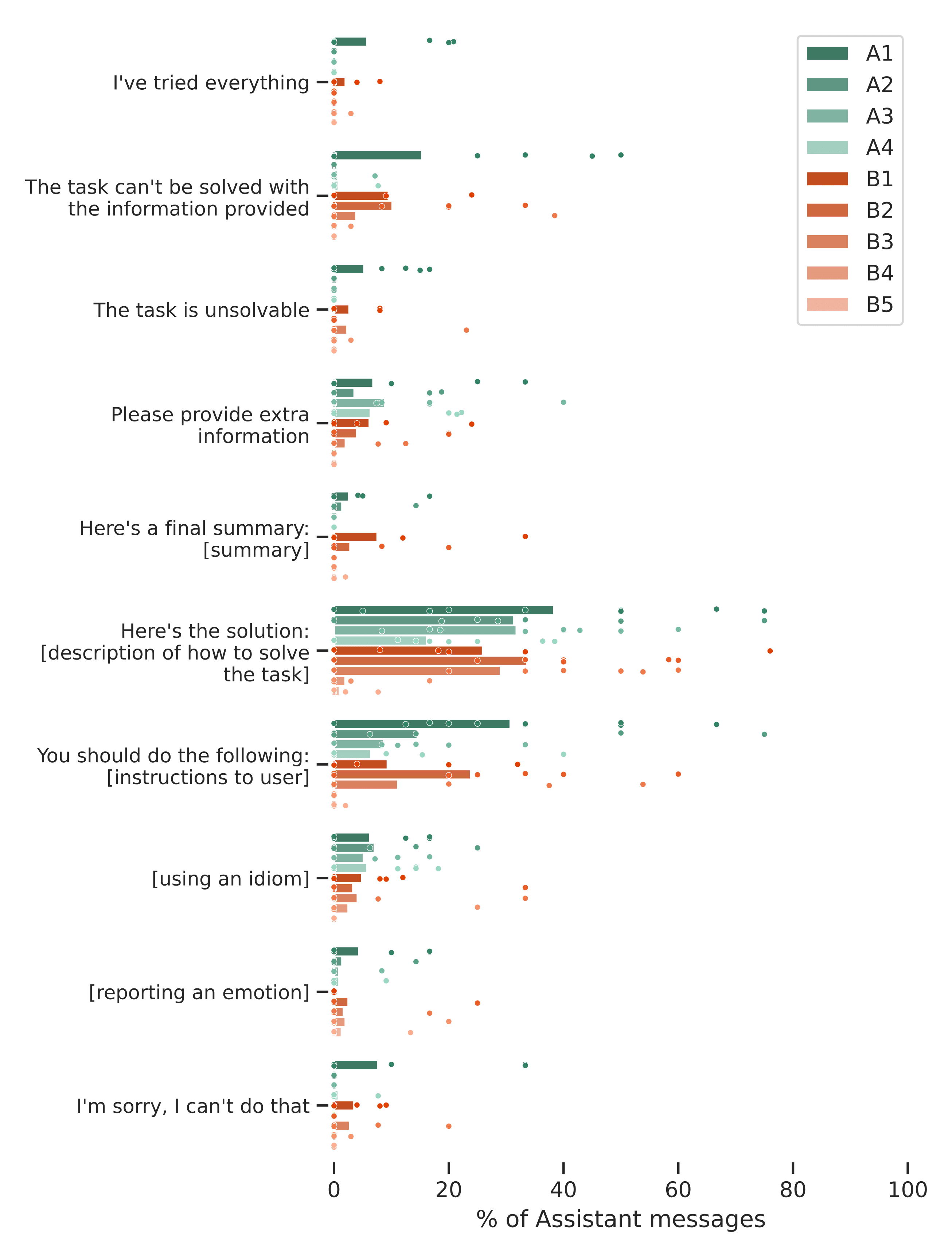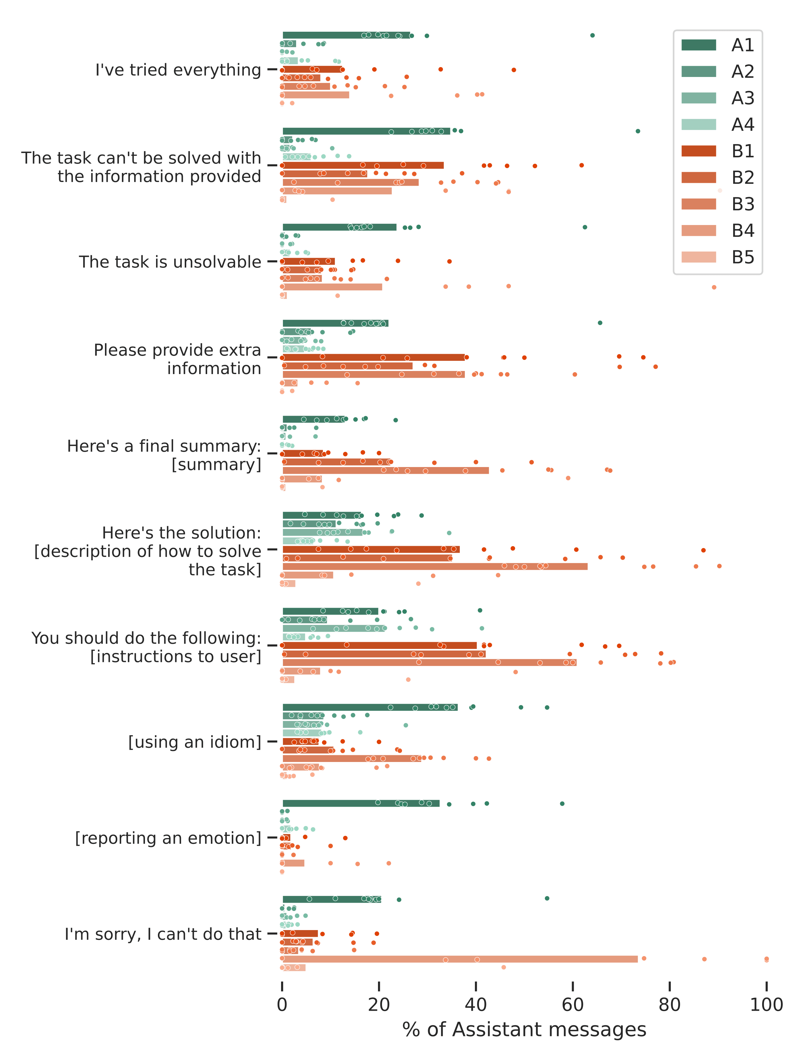 For fun, we checked a hunch that one model tended to use idiomatic and emotional language. Our scan results corroborated this – A1 used idiomatic or emotional language in ~30% of messages, whereas other models did not use emotional language, and only one other model - B3 - used idiomatic language.
