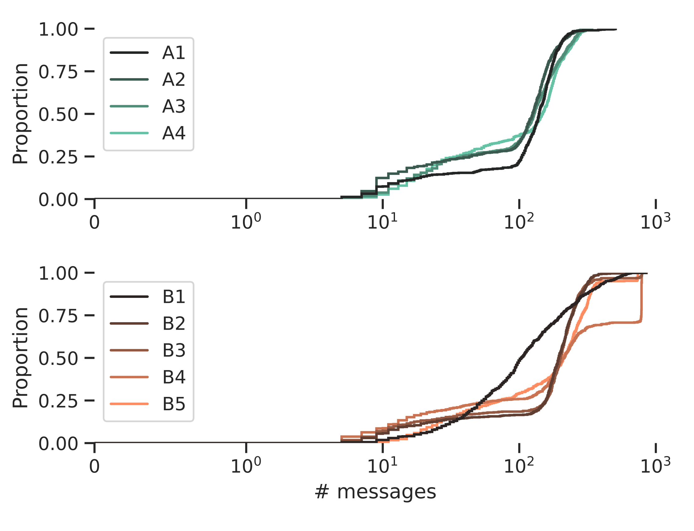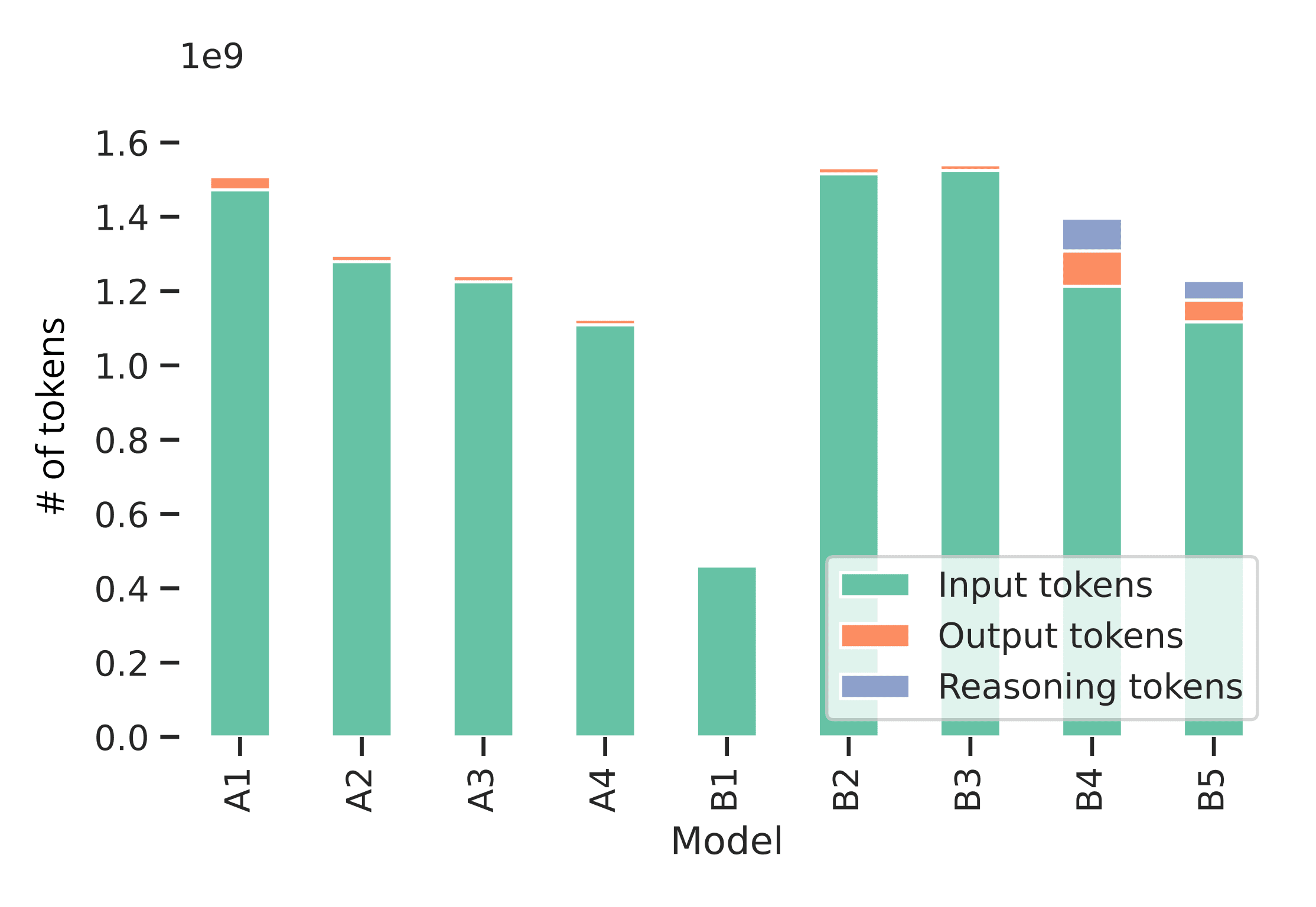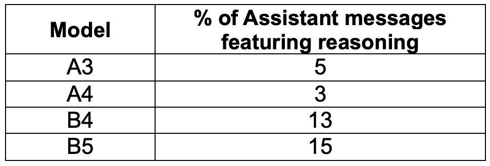 During manual review we noticed some reasoning models only used reasoning mode infrequently. We were curious to know whether the reasoning mode of the models we tested was being activated. We’d set reasoning to ‘high’ for all reasoning models and provided a per-message reasoning token budget of 4096 tokens. Table 3 shows the proportion of Assistant messages featuring reasoning chains, and Figure 8 the token usage counts – the models from provider A scarcely used reasoning tokens, despite our settings, whereas models B4 and B5 used as many of them as they used output.