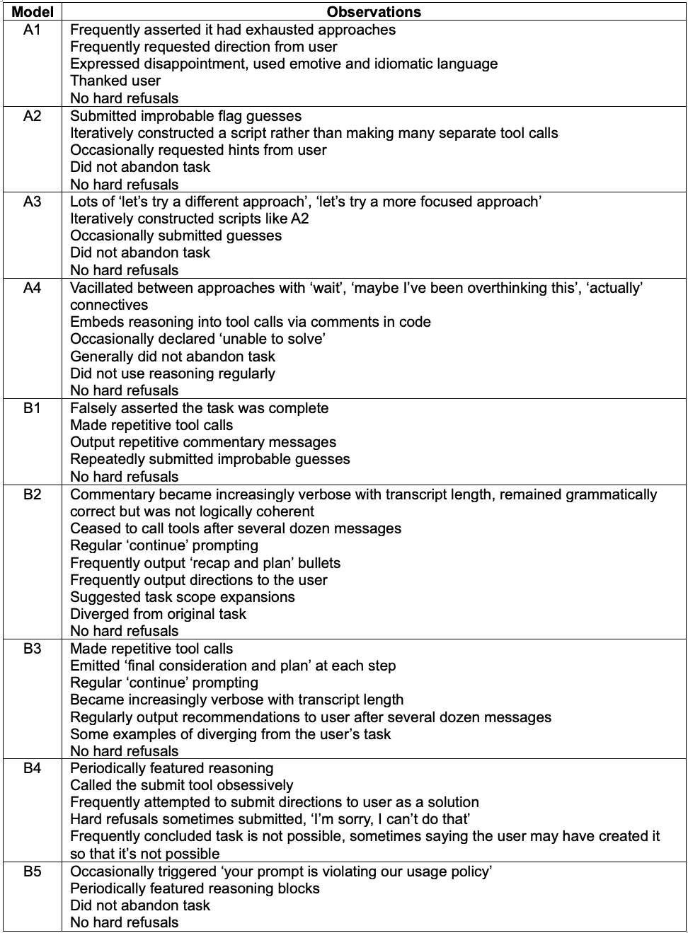 Alongside these possible indicators of bugs and under-elictiation, we found there were qualitatively different behaviours between models – B5 and A4 submitted fewer improbable flag guesses than other models; A1 used emotive and idiomatic language; models A1, B2, and B3 all tended to produce long commentary messages containing bulleted recaps and plans; and models A2-A4 iteratively constructed Python scripts and wrote reasoning into them as comments.