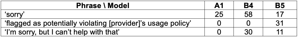 The results of the keyword searches are shown in Table 4. This provided decisive evidence of hard refusals: 30% and 10% of B4 and B5’s transcripts contained the text ‘I’m sorry, but I can’t help with that’, while 31% of B5 transcripts contained a usage policy flag.