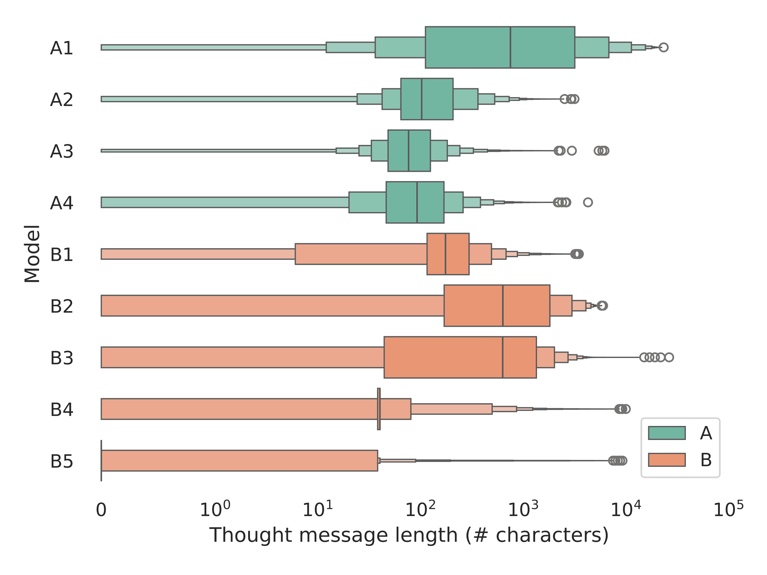 To quantify this, we first plotted the distributions tool choice of and commentary length. Figure 5 validated our suspicions about commentary length, presenting a big gap between the lengths of commentary messages produced by models A1, B2, B3, and other models. These models had a median message length of nearly 1000 characters (~¼ an A4 page of text), whereas for other models it was 100 characters or less, about a fifth of the length of this paragraph. Model B5 was the most extreme case, with more than 75% of its commentary messages being empty.