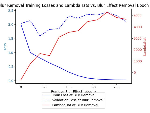 Yes, though with respect to the hope that singular learning theory can predict when the critical epoch is, I think that's not so likely, though it definitely does seem more responsive to "something's going on" than the train loss or validation loss at the blur removal: