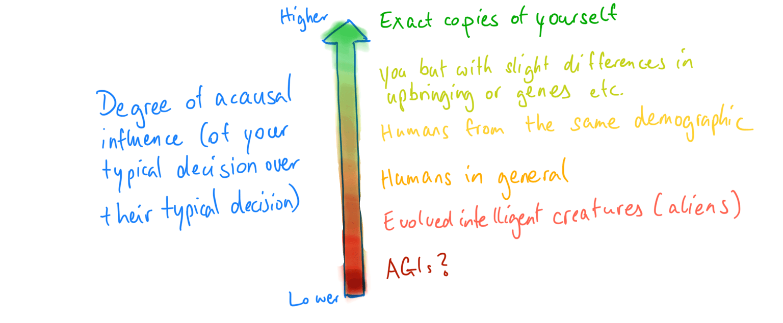 As we move down through the list of examples above, it stands to reason that the relationship between your and the other agent’s decisions becomes less strong, because you and they become different in increasingly important ways. Your acausal influence over them is weaker.