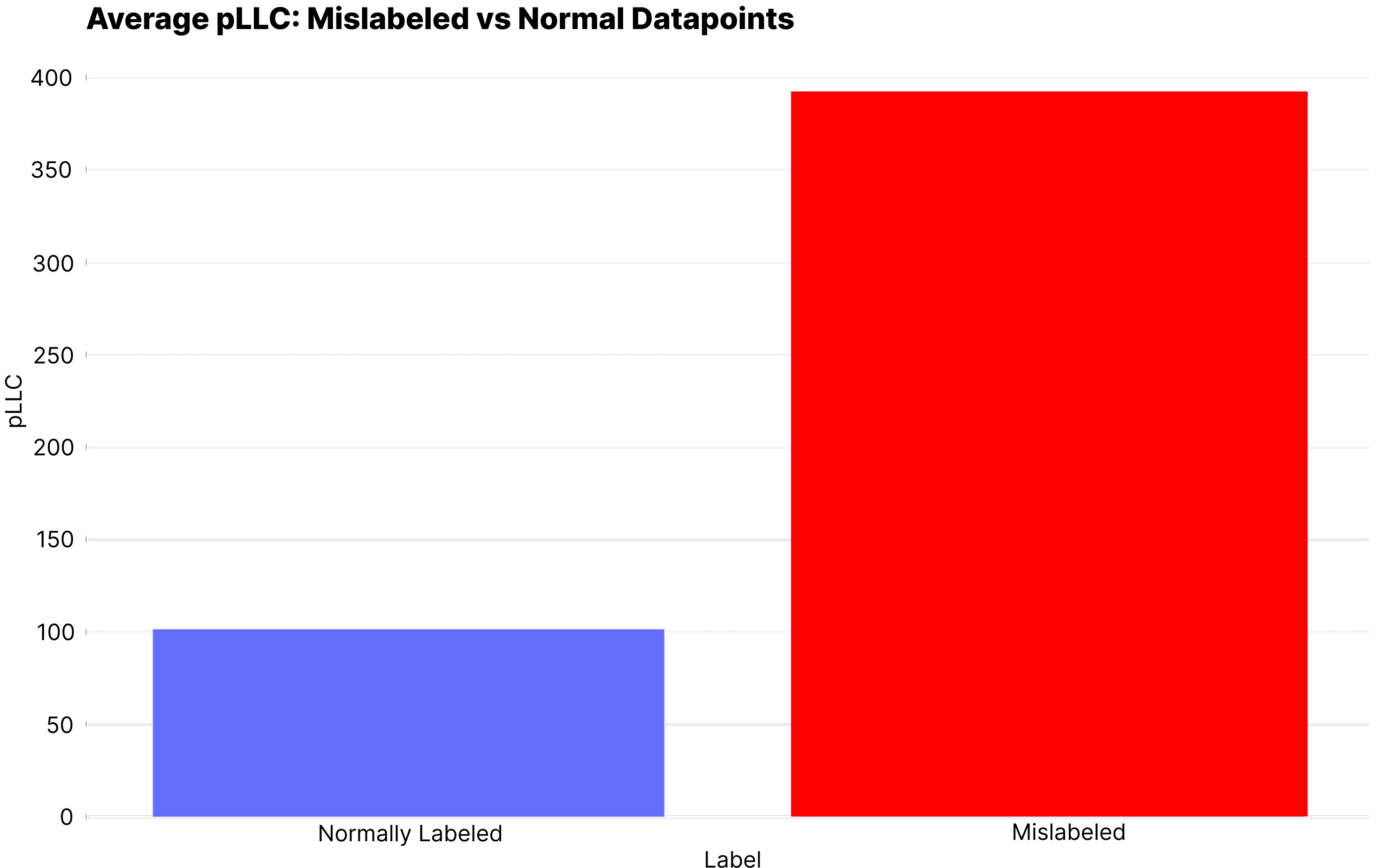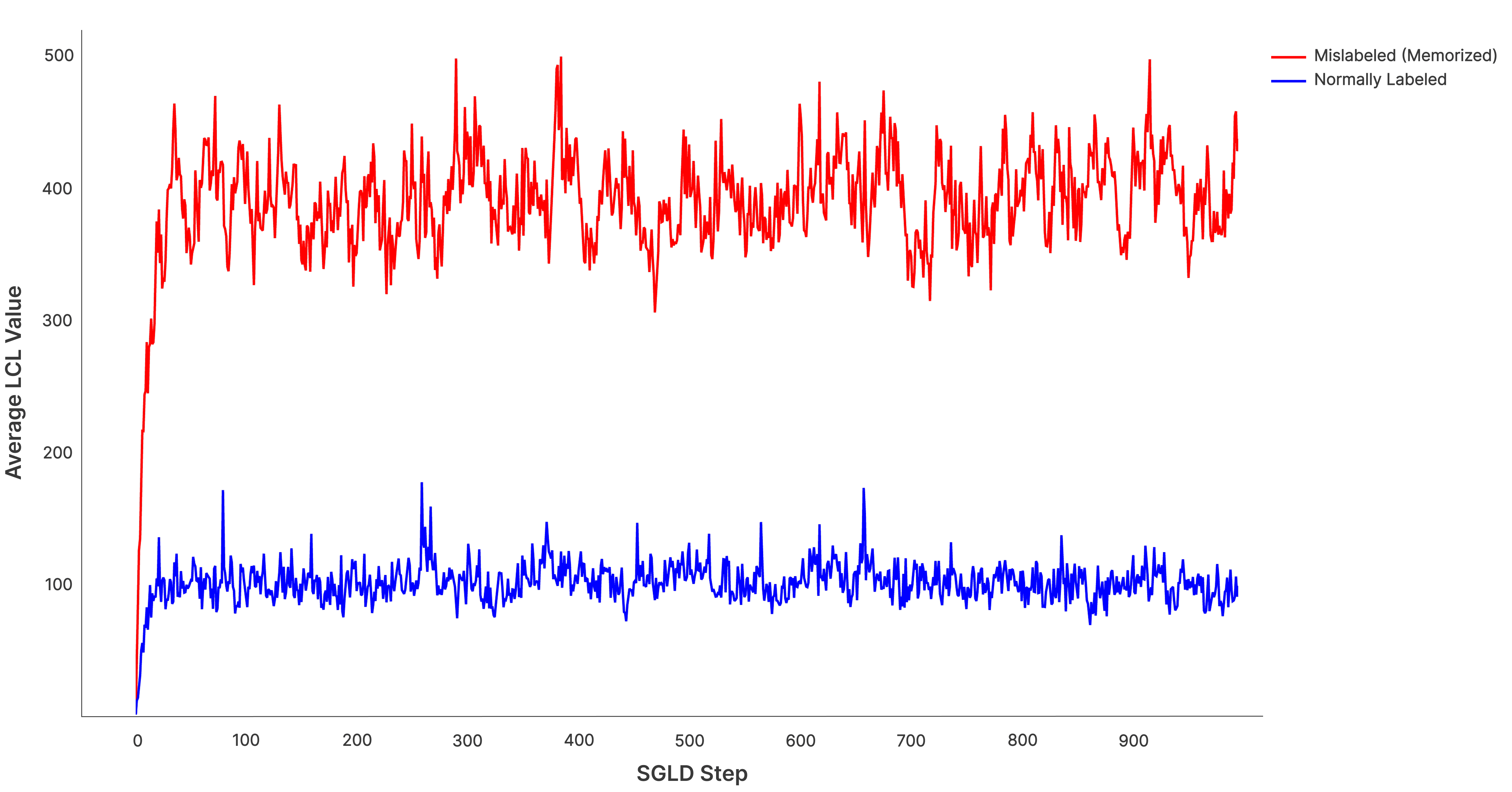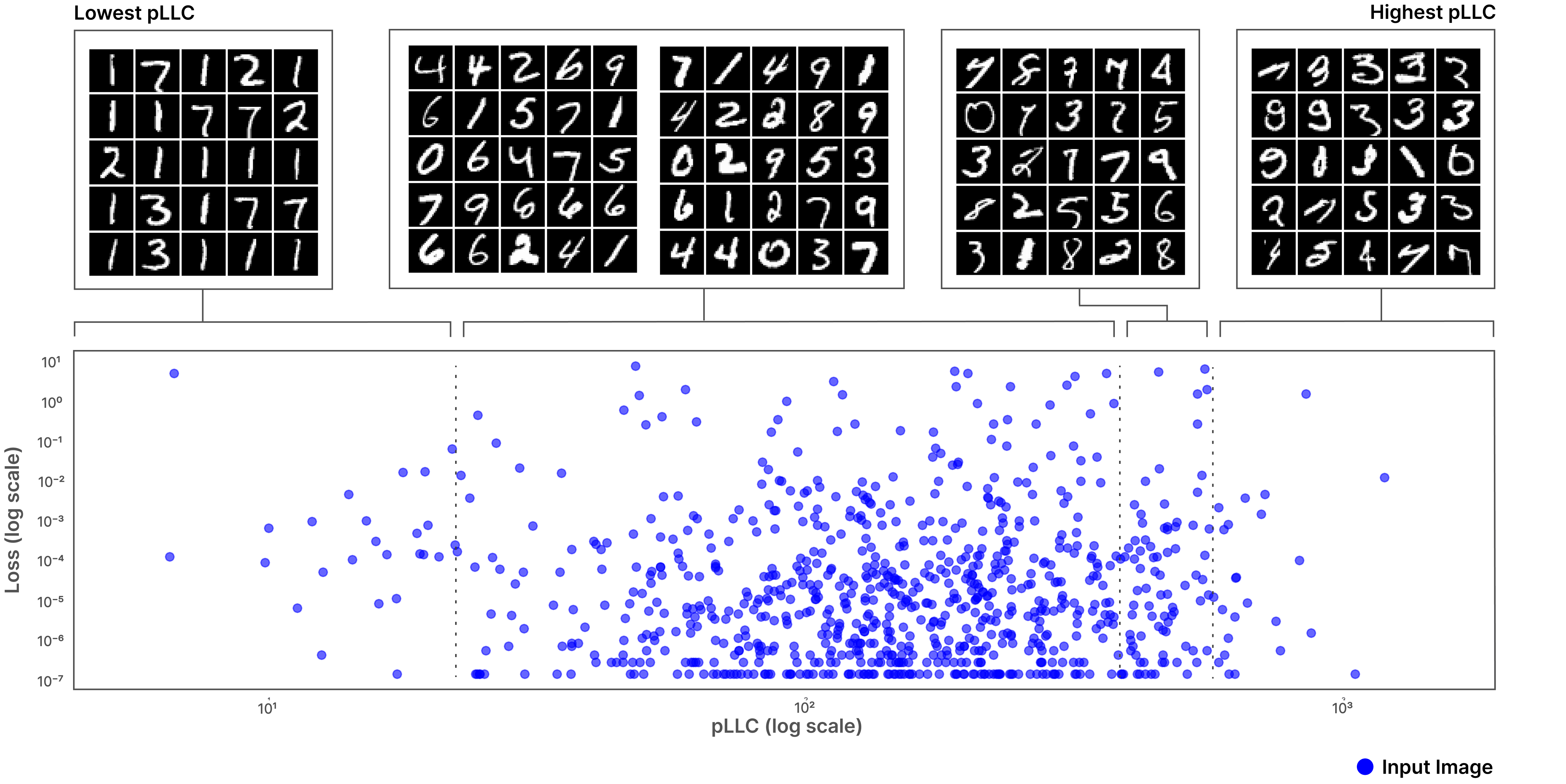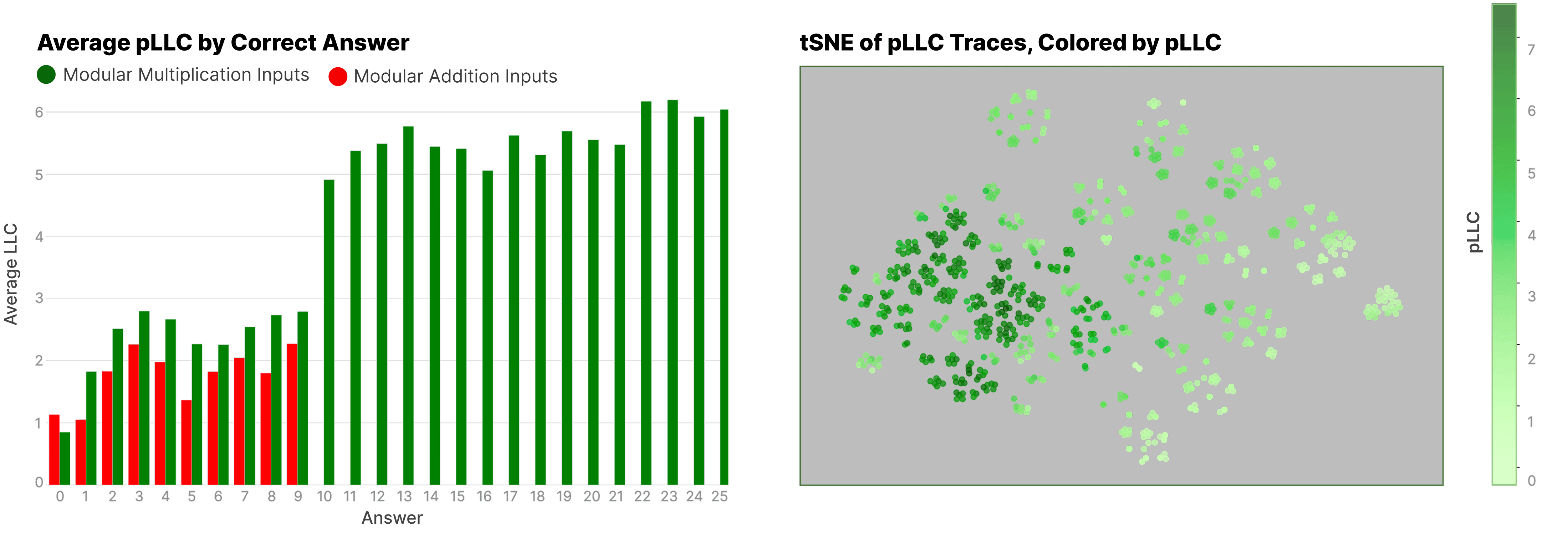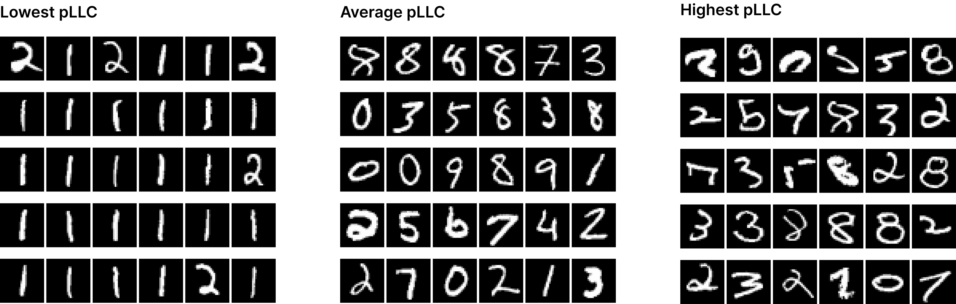In the next section, we'll use the pLLC as a scalar metric of 'complexity' which we can use to distinguish memorized inputs from inputs with generalizing features. We hypothesize that inputs a model memorizes will have the highest per-sample LLC values, as memorization is the most fragile and least efficient form of computation. Memorization should rely on highly specific parameter configurations, which degrade rapidly under small perturbations introduced by SGLD sampling. Thus, measuring per-sample LLCs provides a direct means to distinguish memorized inputs (high LLC) from inputs that utilize more general and robust circuits (lower LLC).