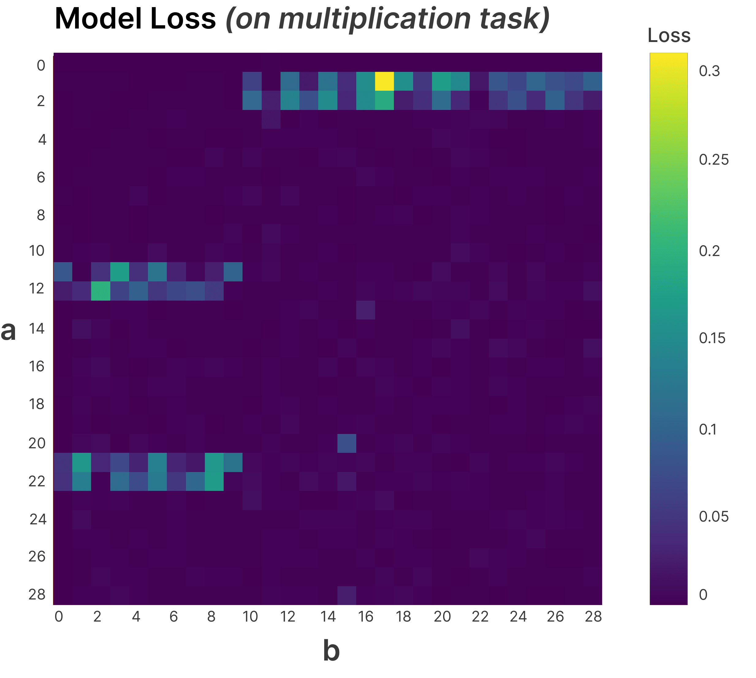 This plot shows the model's loss for each input a,b on the multiplication task. Once again, we see that the pLLC is not just reflecting the initial loss, which seems to indicate that we are measuring something non-trivial about our model. While our model isn't perfect, it gets most inputs correct, which we could argue actually makes interpretability more difficult.