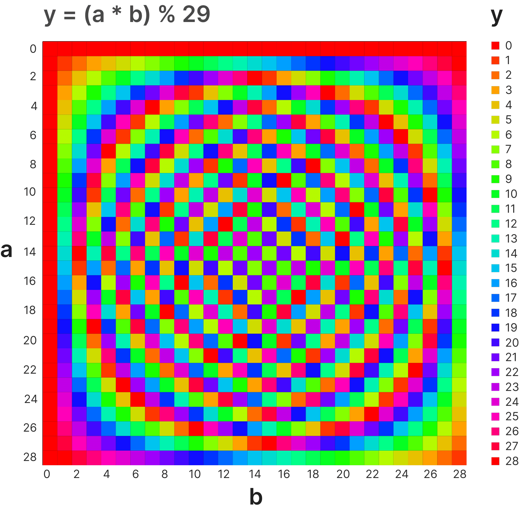 The above plot is the 'modular multiplication table' for mod 29. Spirals (or rings) emerge from the wraparound in modular arithmetic. Because each step “wraps around” at 29, you get repeating colour sequences in each row and column. Overlaying these repeating sequences in two dimensions often creates moiré-like rings or spirals. Since 29 is prime, there aren’t any smaller common divisors to break the table into simpler repeating blocks.