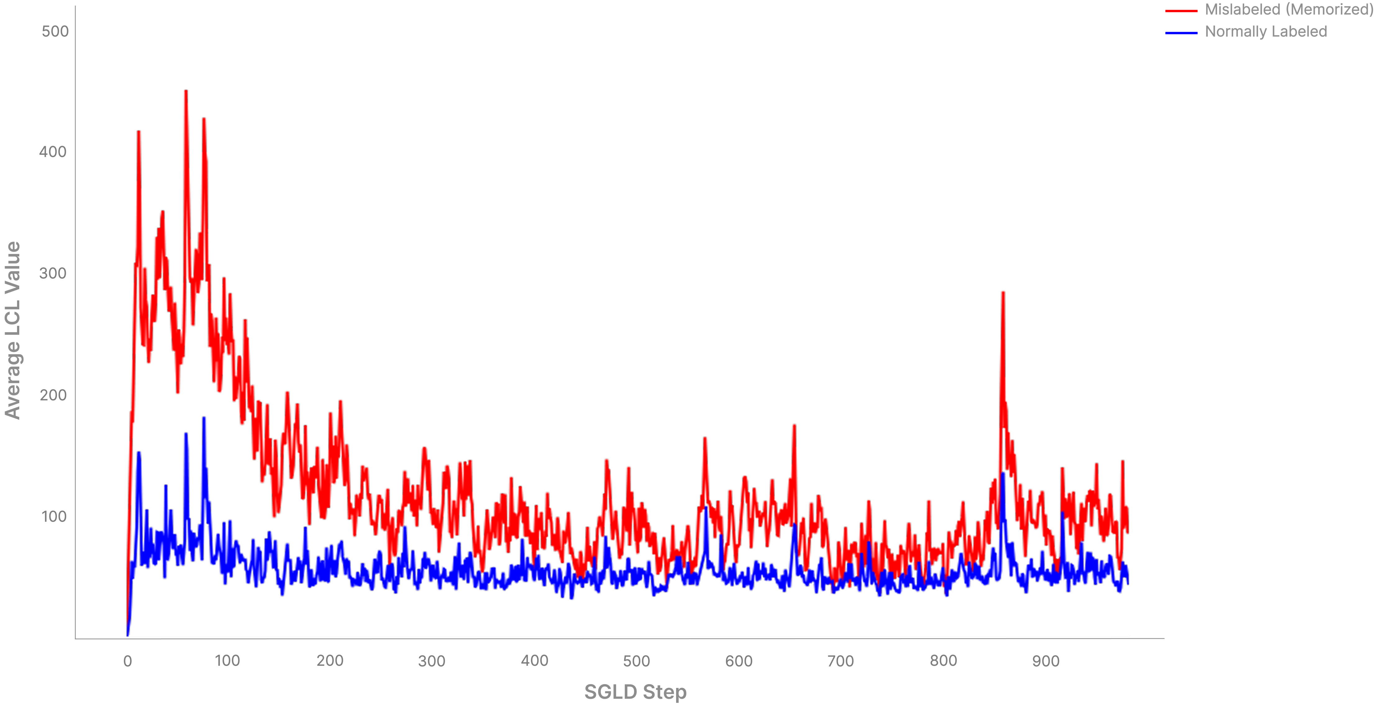 This suggests a natural way to measure memorization in real networks: instead of looking at the total loss, we should examine how loss degrades for individual data points. If memorization is fragile, we should see much sharper loss degradation for memorized points than for generalized ones. This motivates our introduction of the Per-Sample Local Learning Coefficient (pLLC).