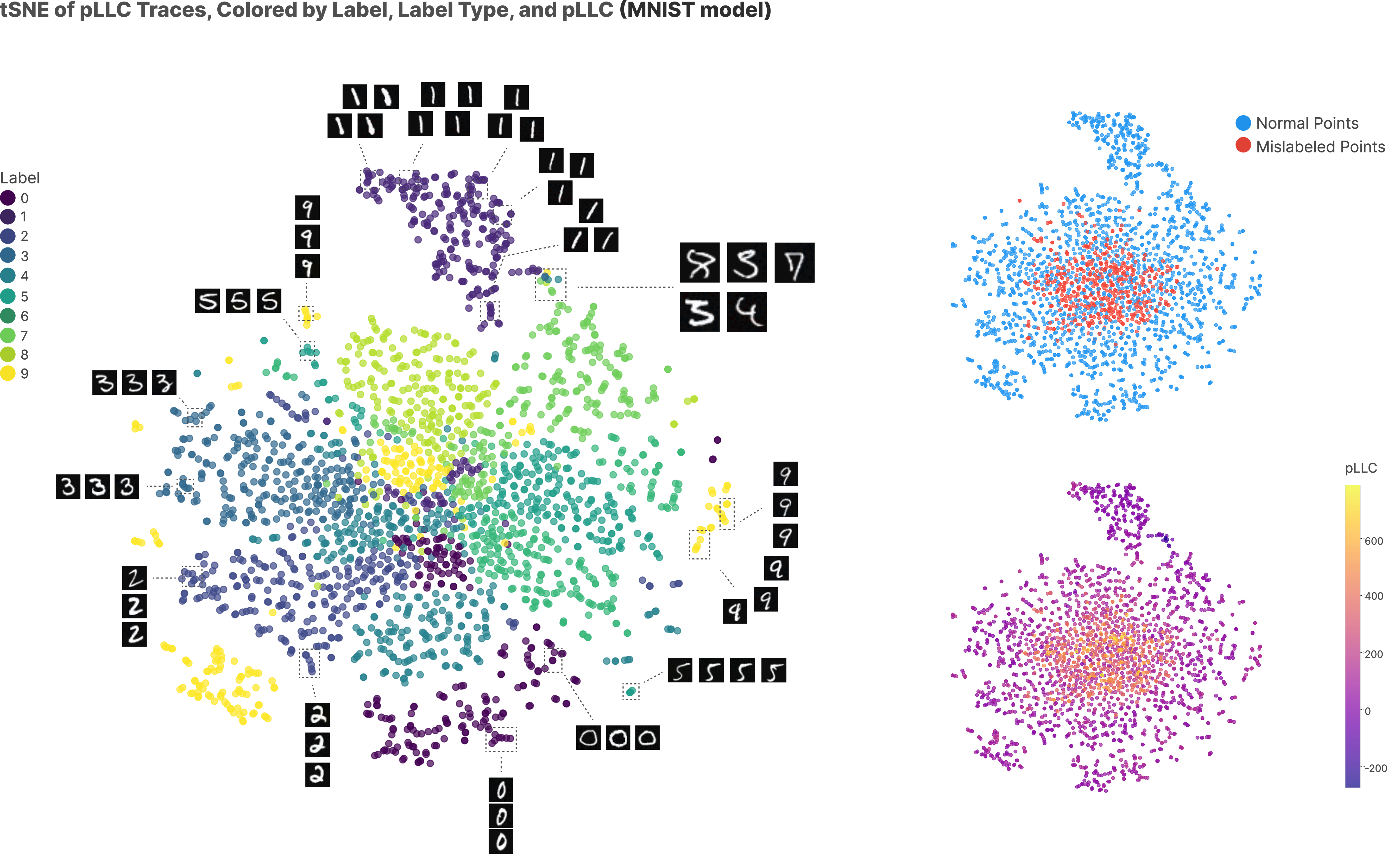 We see that the losses on mislabeled points and normal points converge to a steady value - we find that traces that converge give more interpretable clusters than traces that don't. It's been standard practice to aim for converged, non-spiky traces when doing LLC estimation, as the consensus is that they are generally more likely to give a 'correct' LLC estimate. LLC estimation, however, is a bit more of an art than a science, and so techniques that break down the estimation into parts (like this) are likely good avenues for gaining more insight into what our 'estimate' is actually 'estimating'.