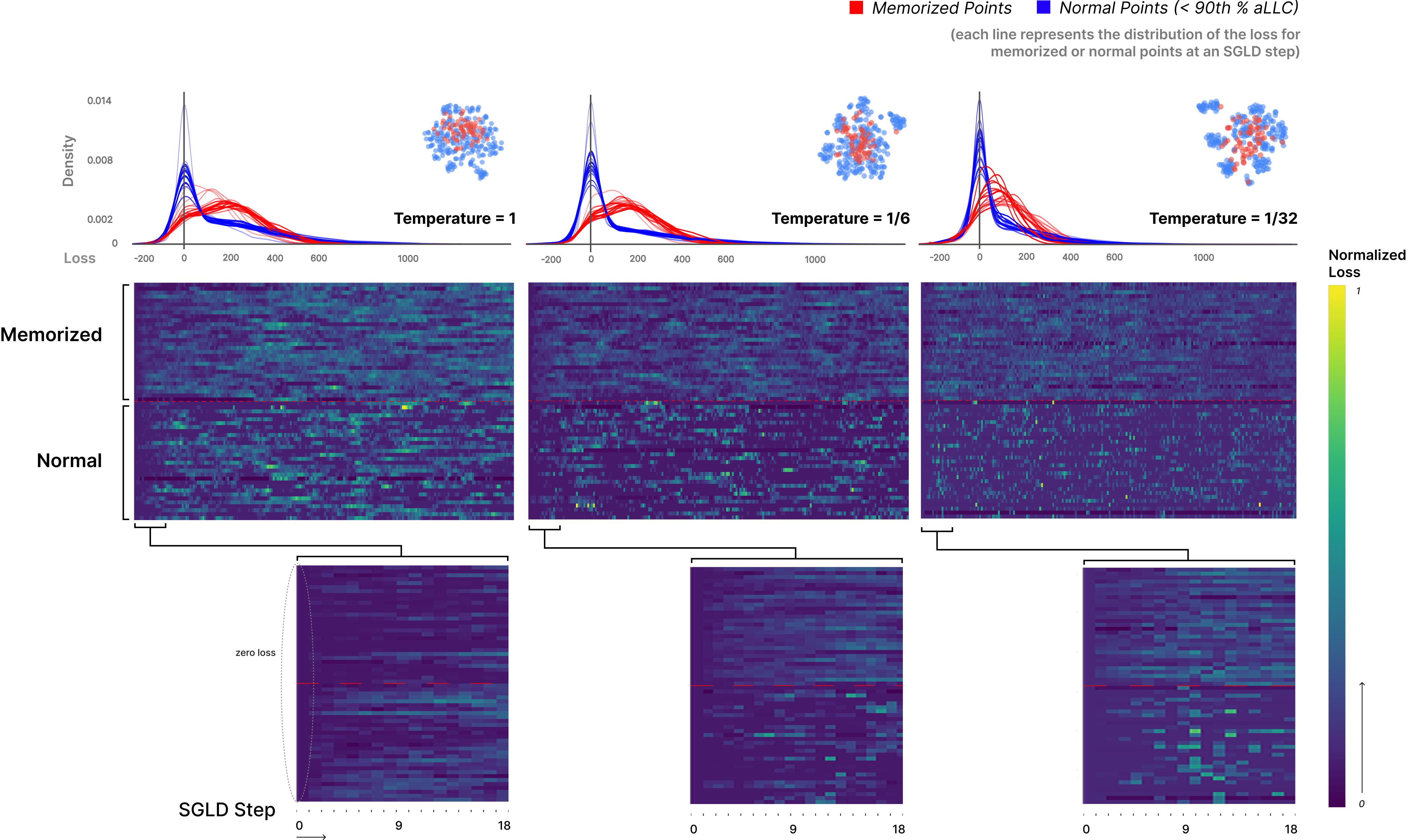 In the MNIST setting, we showed that memorized examples have distinctly higher pLLC values and cluster distinctly when analyzing loss patterns over the tempered posterior. In our modular arithmetic transformer, we successfully grouped model behaviors in interpretable ways at various temperatures, revealing that structural patterns emerge at different temperature scales. Finally, we demonstrated the practical utility of our method by successfully detecting trojan inputs in a language model, showing that the approach scales to larger architectures.