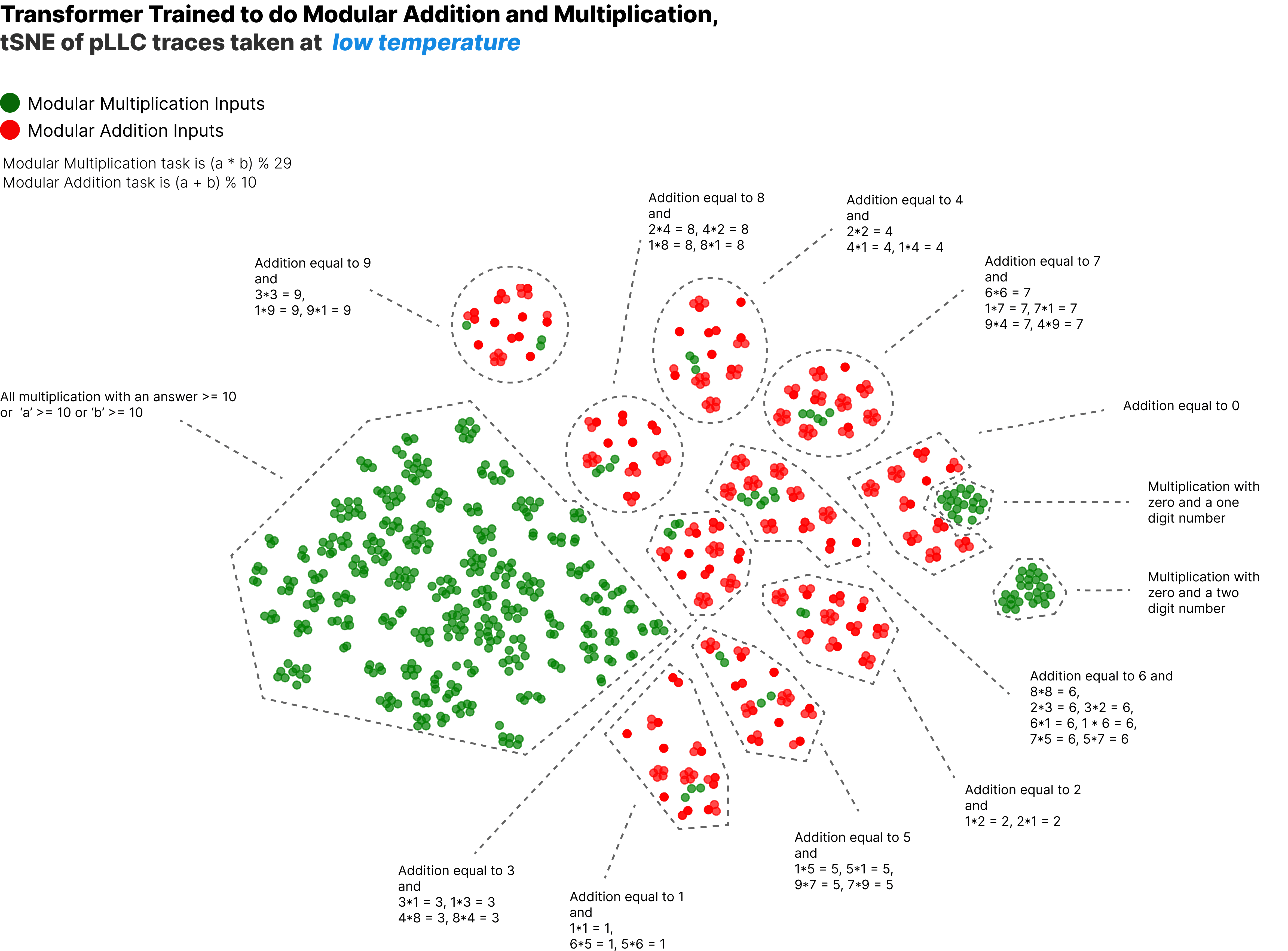 There are similarities and differences between our two tSNEs taken at different temperatures. In both, we see single-digit multiplication with an answer less than 10 clustering in with addition - the difference is that in the low-temperature version these group with the addition clusters by label, whereas in the high-temperature version they are randomly scattered throughout the addition cluster. In the high-temperature version, addition inputs form distinct clusters while multiplication is just a 'blob' - in the low temperature version the reverse is true, and multiplication inputs form distinct clusters while addition inputs are diffuse.