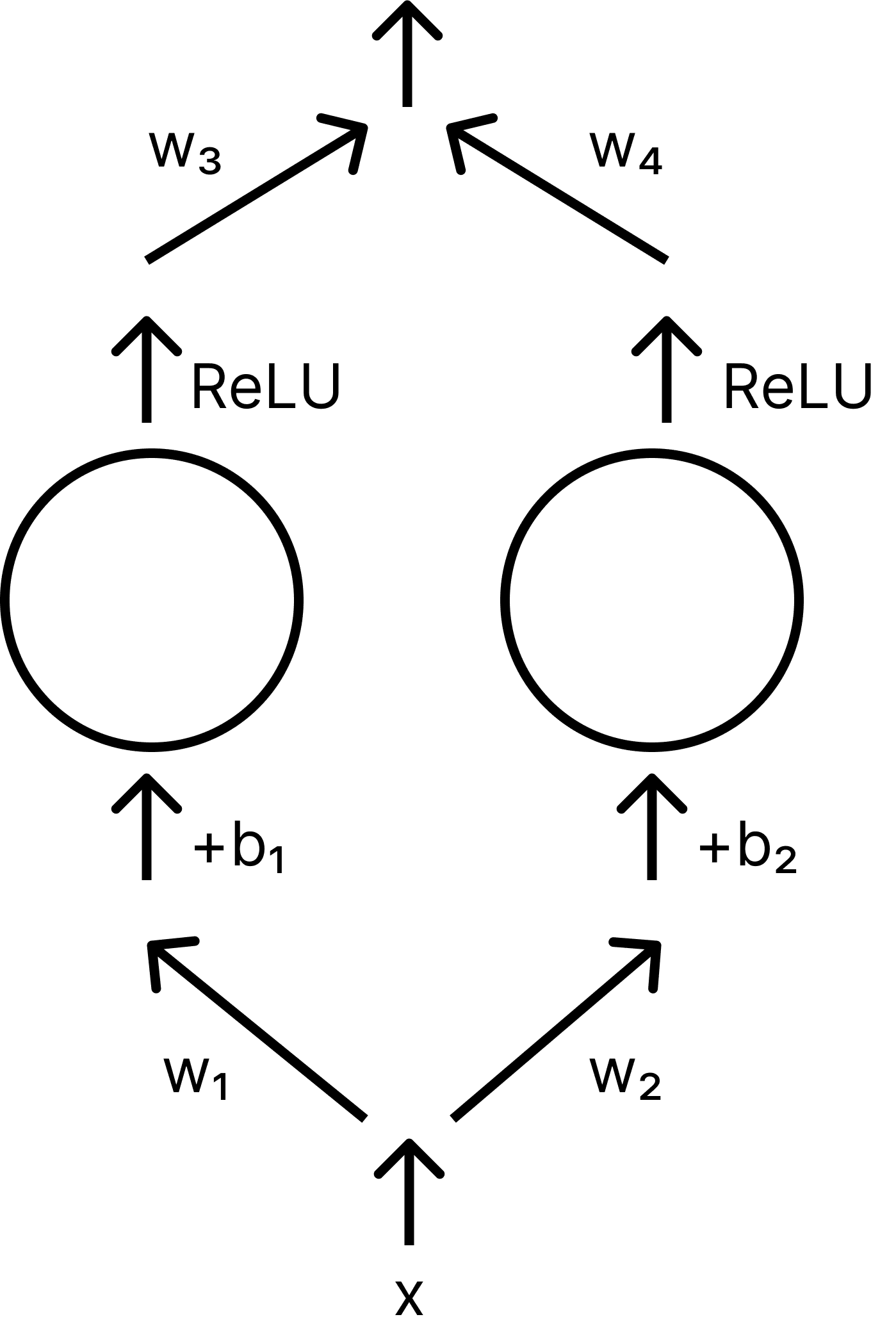 The reason this works is because of our new ReLU's; if x is sufficiently close to p then we will have x+b1 be slightly negative and x+b2 slightly positive. Because the ReLU on x+b1 will chop it to zero, we'll be left with only a positive signal coming from the right-hand path through the model. This small positive value can then be rescaled by an arbitrarily large w4.
