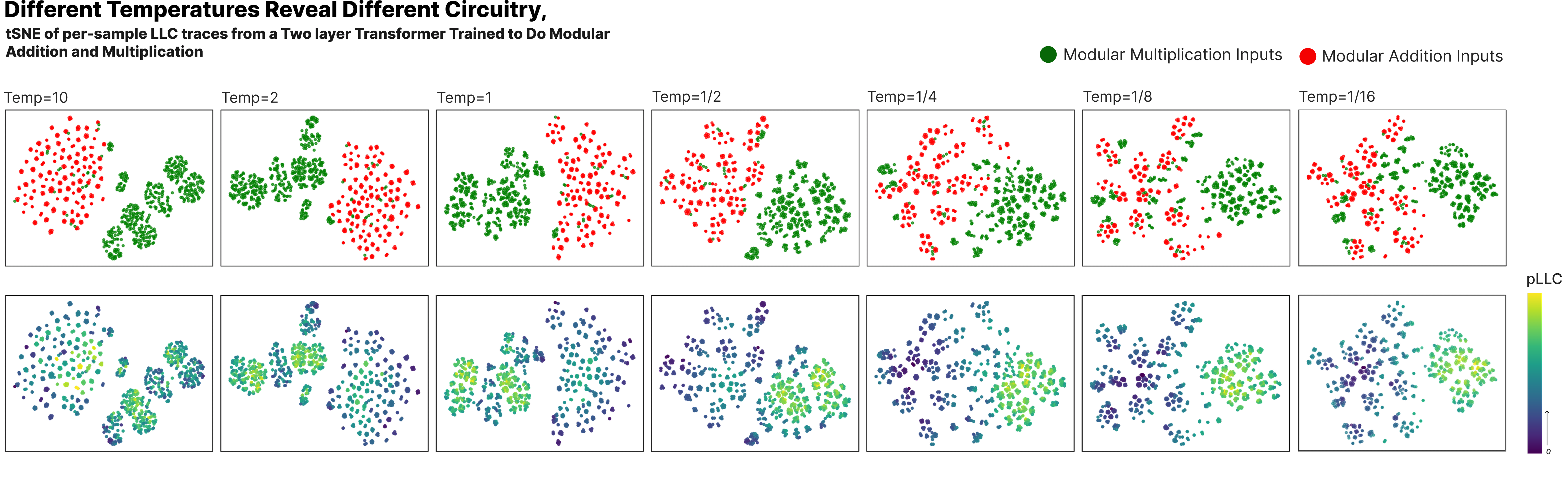 We find that clustering pLLC traces at different temperatures reveals significantly different and interpretable structures. The below plot shows tSNEs of pLLC traces taken at different temperatures, sampled from our multi-task toy transformer. We collect traces in the same way as in the previous plot.