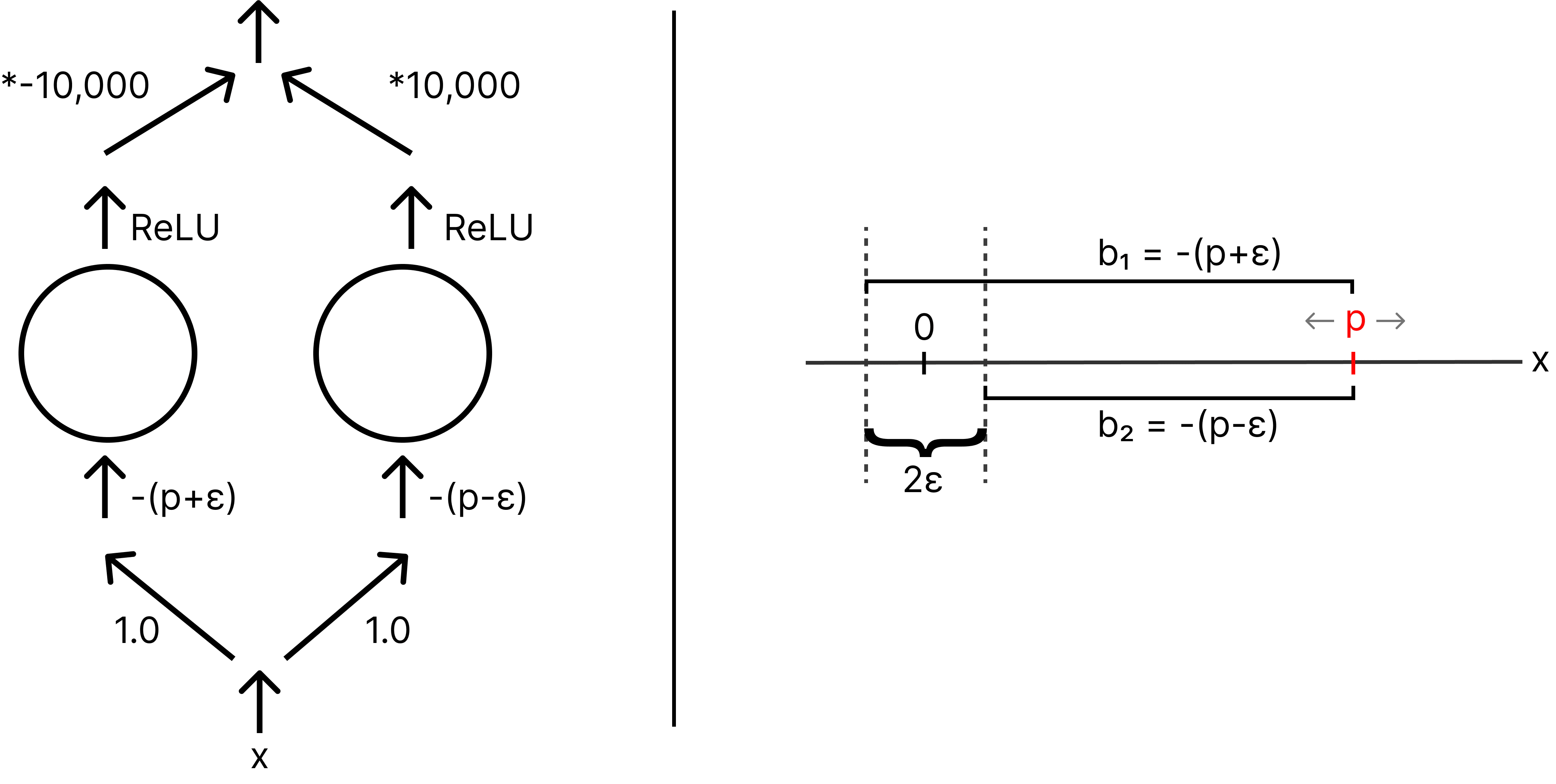 As we can see, our model is able to 'memorize' the input x=p as ϵ gets small by making use of both biases, which work together to align a 'window' around 0 when x is within ±ϵ of p.