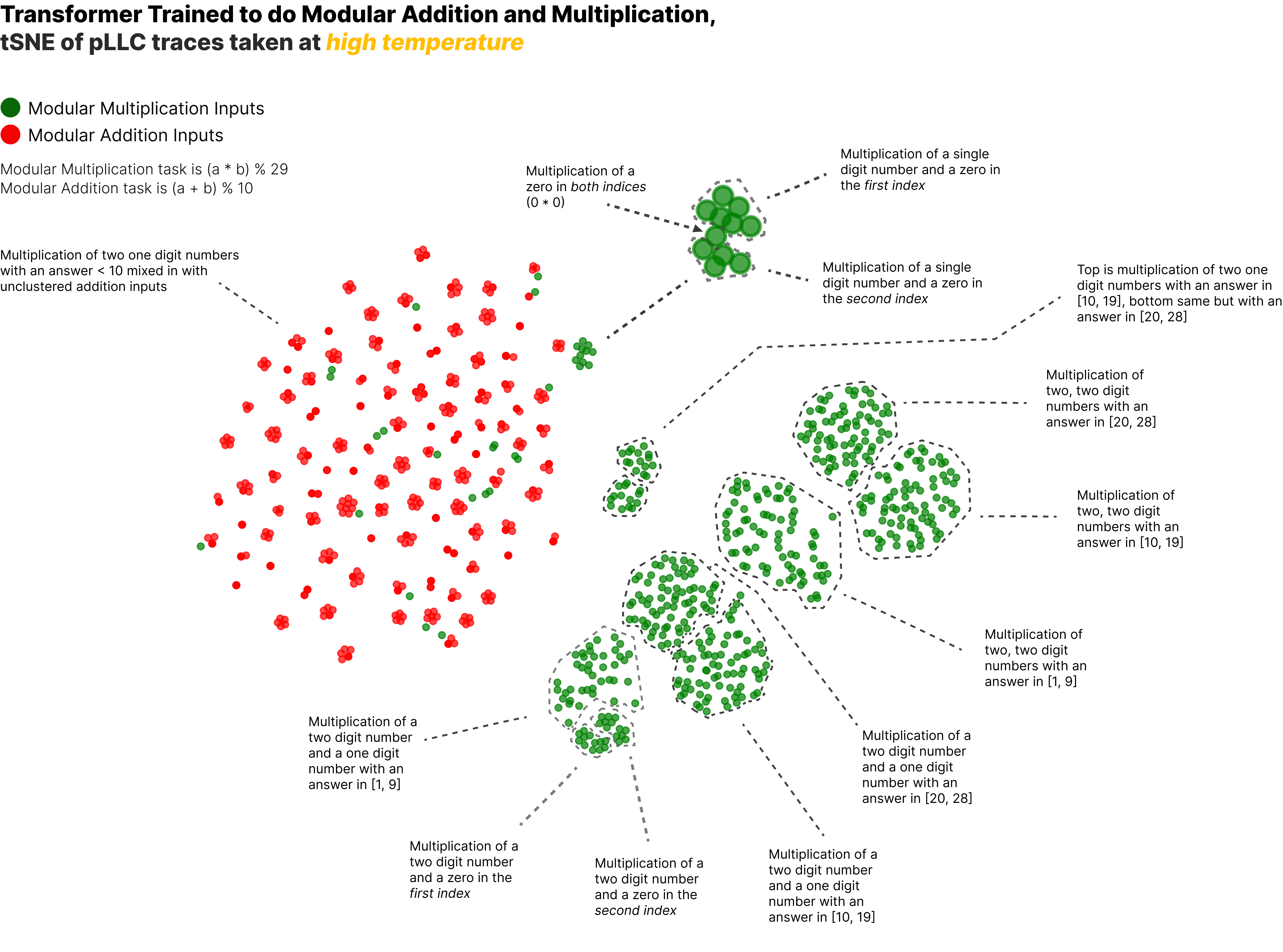 In this high-temperature clustering, we again observe a clear separation between addition and multiplication tasks, but instead of addition inputs having interpretable sub-clusters as we saw at low temperature, we now see multiplication divided into clusters corresponding to operand properties like digit length, or the presence of zeros, or quite clearly an answer range, specifically [1−10), [10,20) and [20,28).