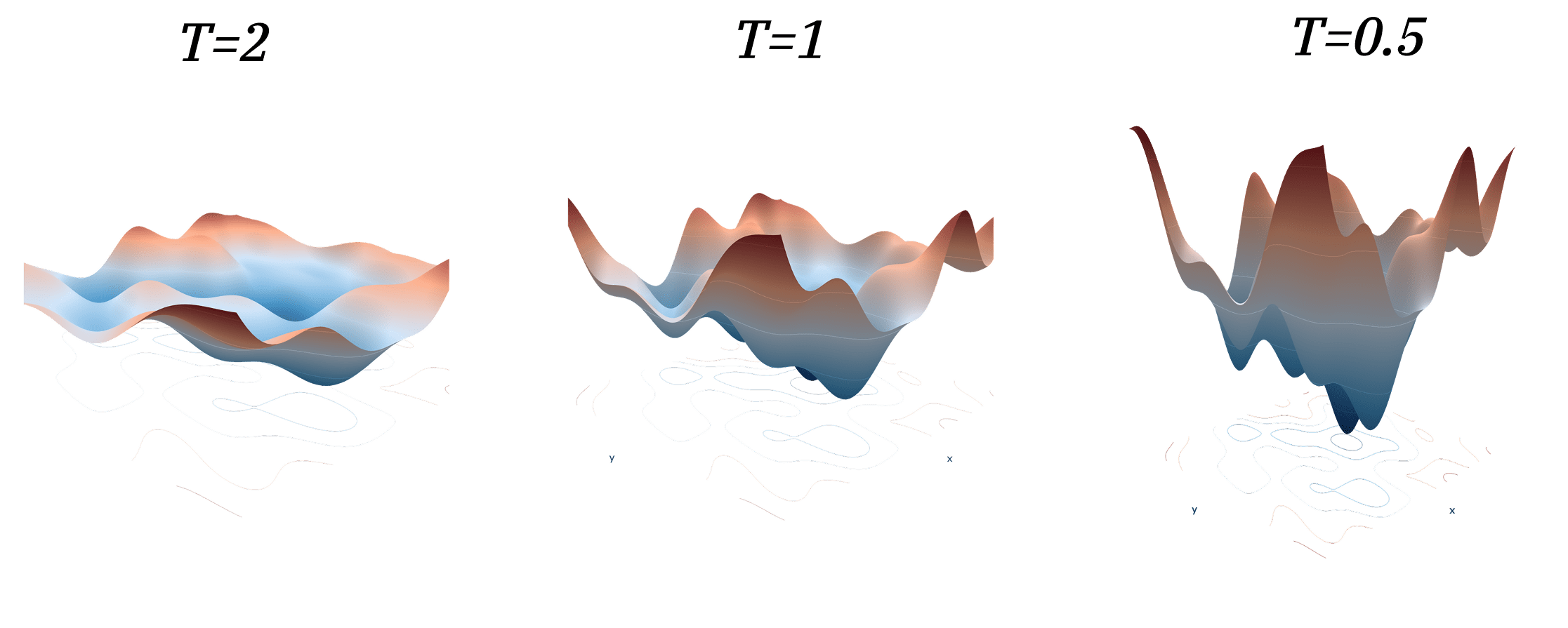 Practically speaking, changing the temperature alters the shape of the parameter distribution we sample from: a high temperature allows broader exploration of the loss landscape, whereas lower temperature confines sampling tightly around the local minimum.