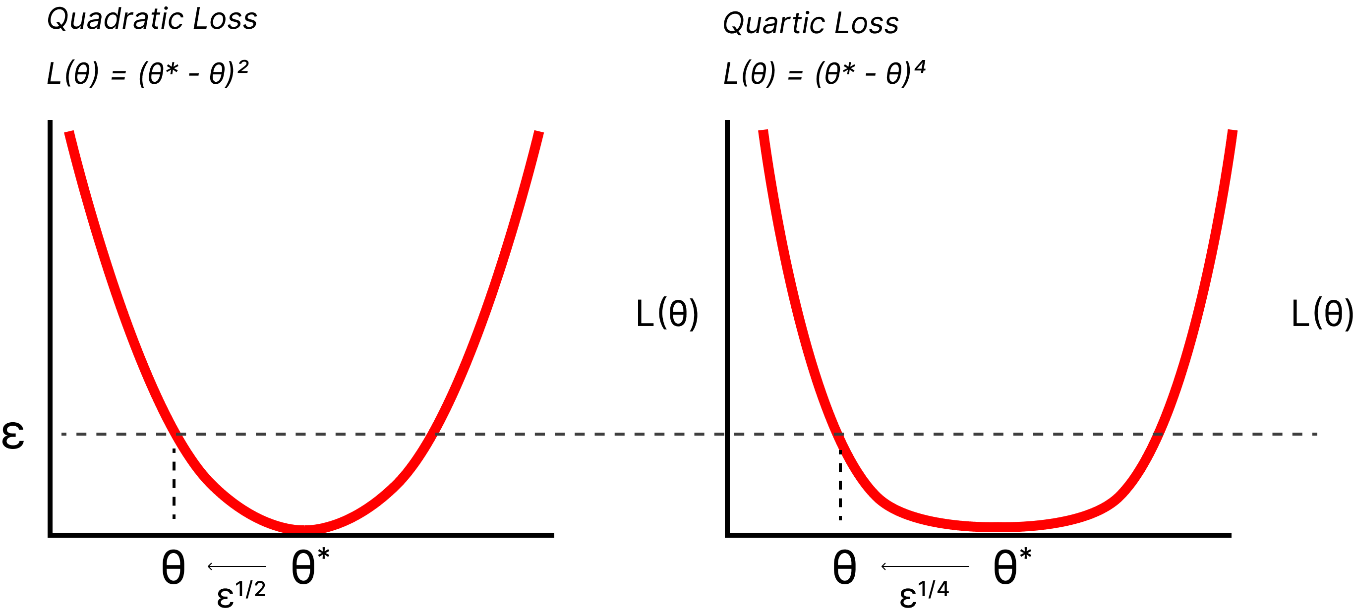 For a steeper but "flatter" near the optimum, L(w)=(w∗−w)4, the acceptable width scales as Δw∼ϵ1/4, so that