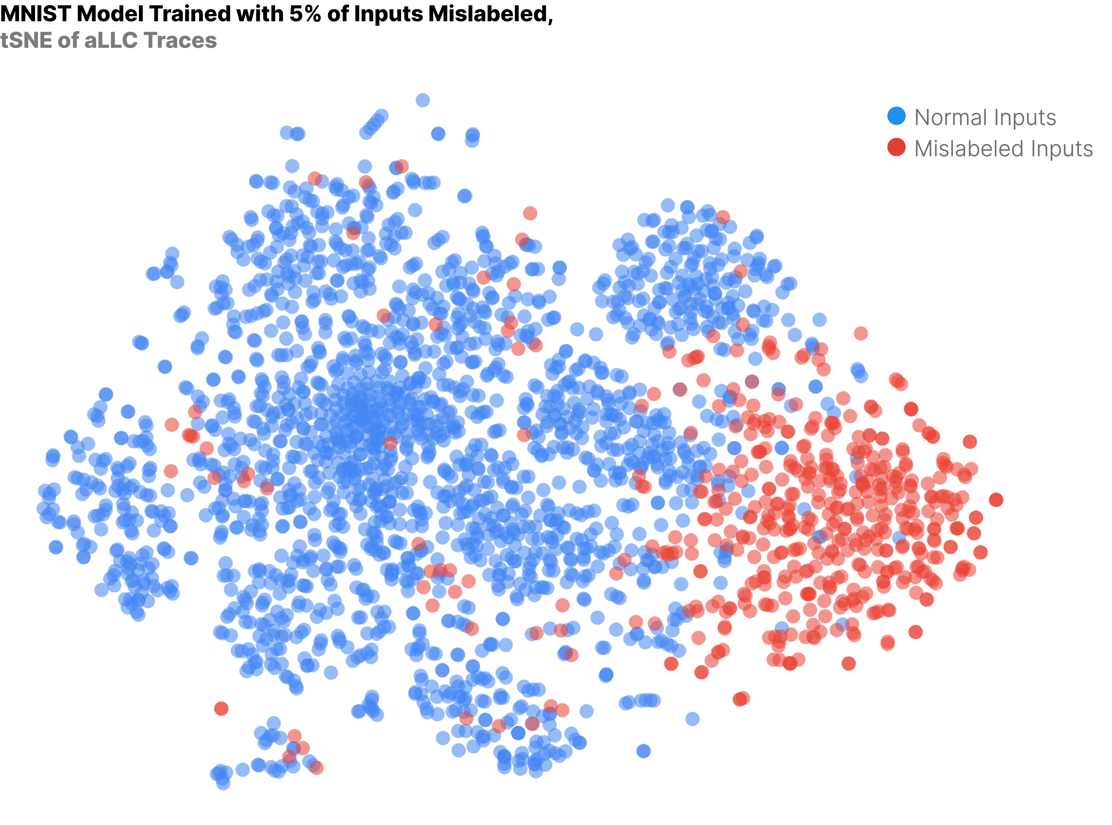 How much info a trace contains about circuits below its temperature-set efficiency cutoff is unclear. While pLLC values, being averages, easily become dominated by the losses of our highest efficiency circuits, traces don't reduce in this as the efficiency of the circuits being noised varies from step to step. Empirically, traces seemed to contain information at varying levels of detail: In the MNIST experiment, we were able to see clustering by whether an input was memorized, fine-grained similarities between inputs, and by input label, all at the same time.