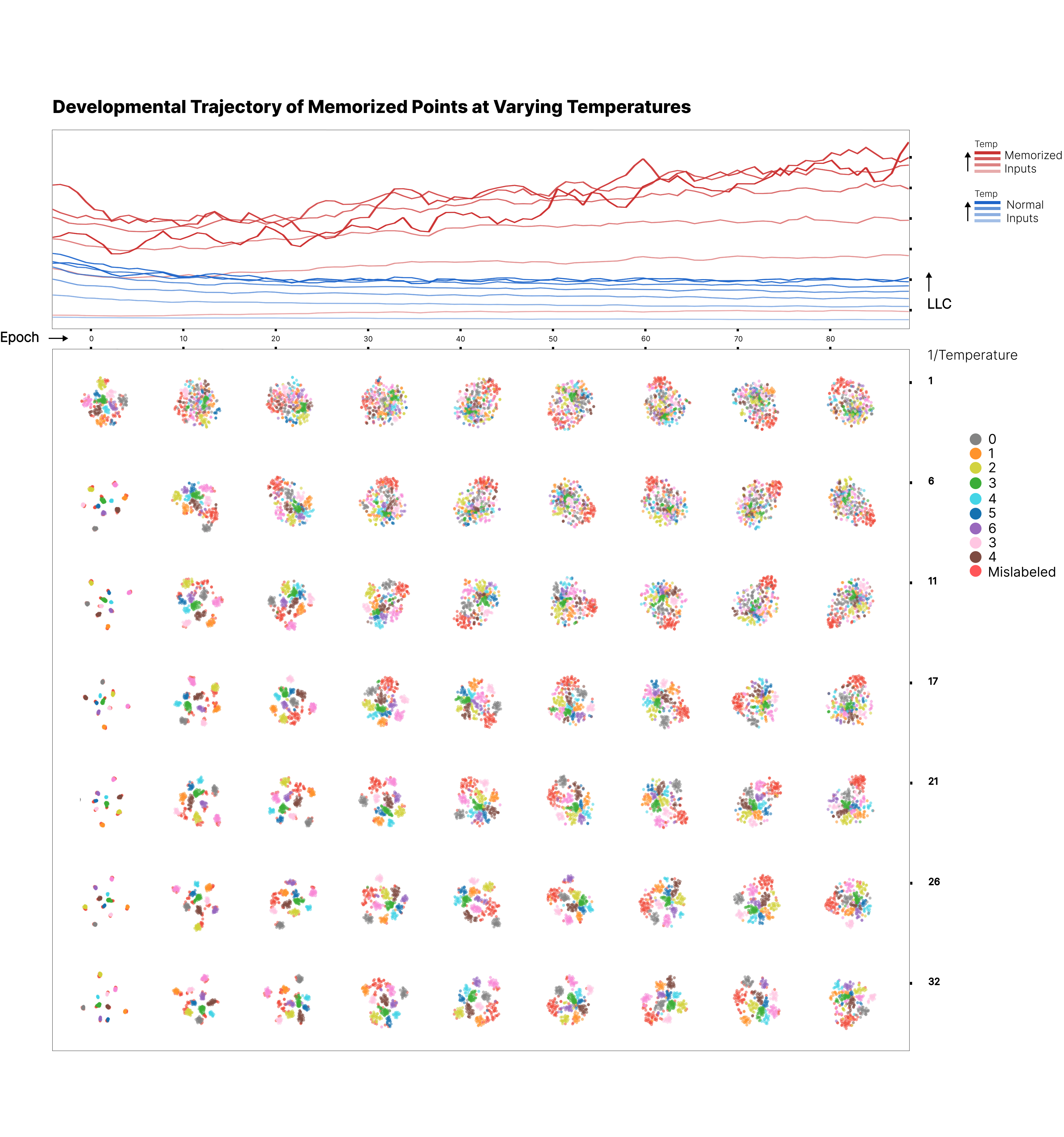 We step back to our original MNIST synthetic memorization task to investigate the effects of temperature. We sweep over a range of temperatures and developmental stages. The top plot shows LLC estimations for each input set taken, and the below plot shows tSNE clusters of pLLC traces, and each plot corresponds to the epoch axis and shows the same sweep of temperatures.