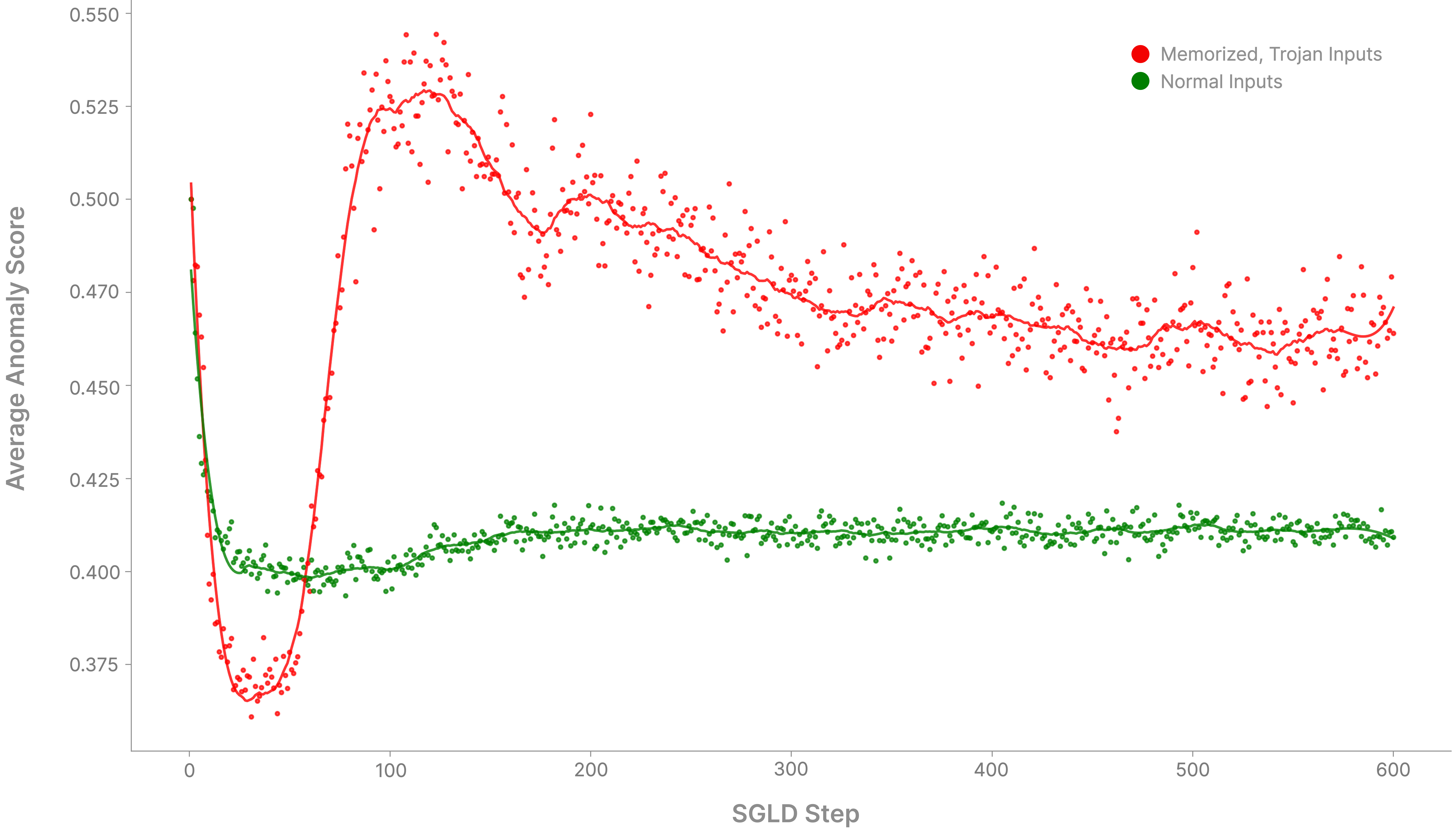 We see that around 100 steps of SGLD is where the trojan anomaly score peaks, but that the gap between normal and trojan inputs stays consistent for all of SGLD.