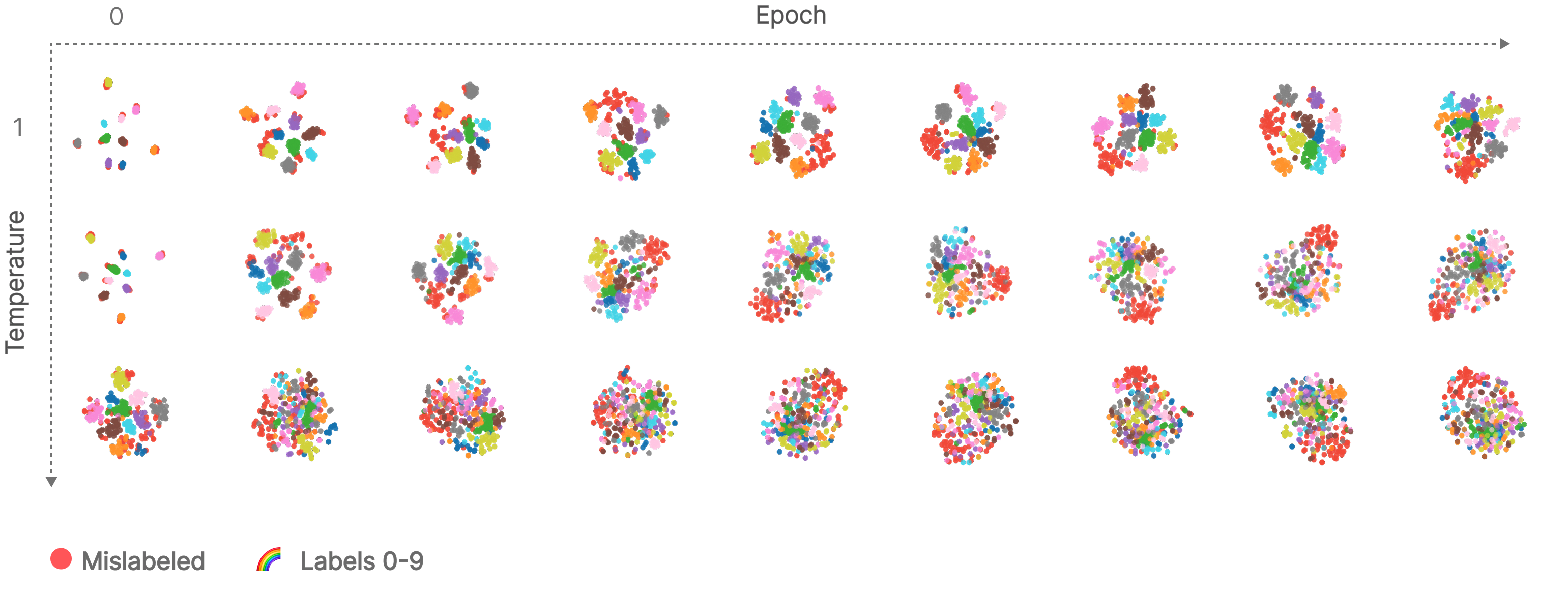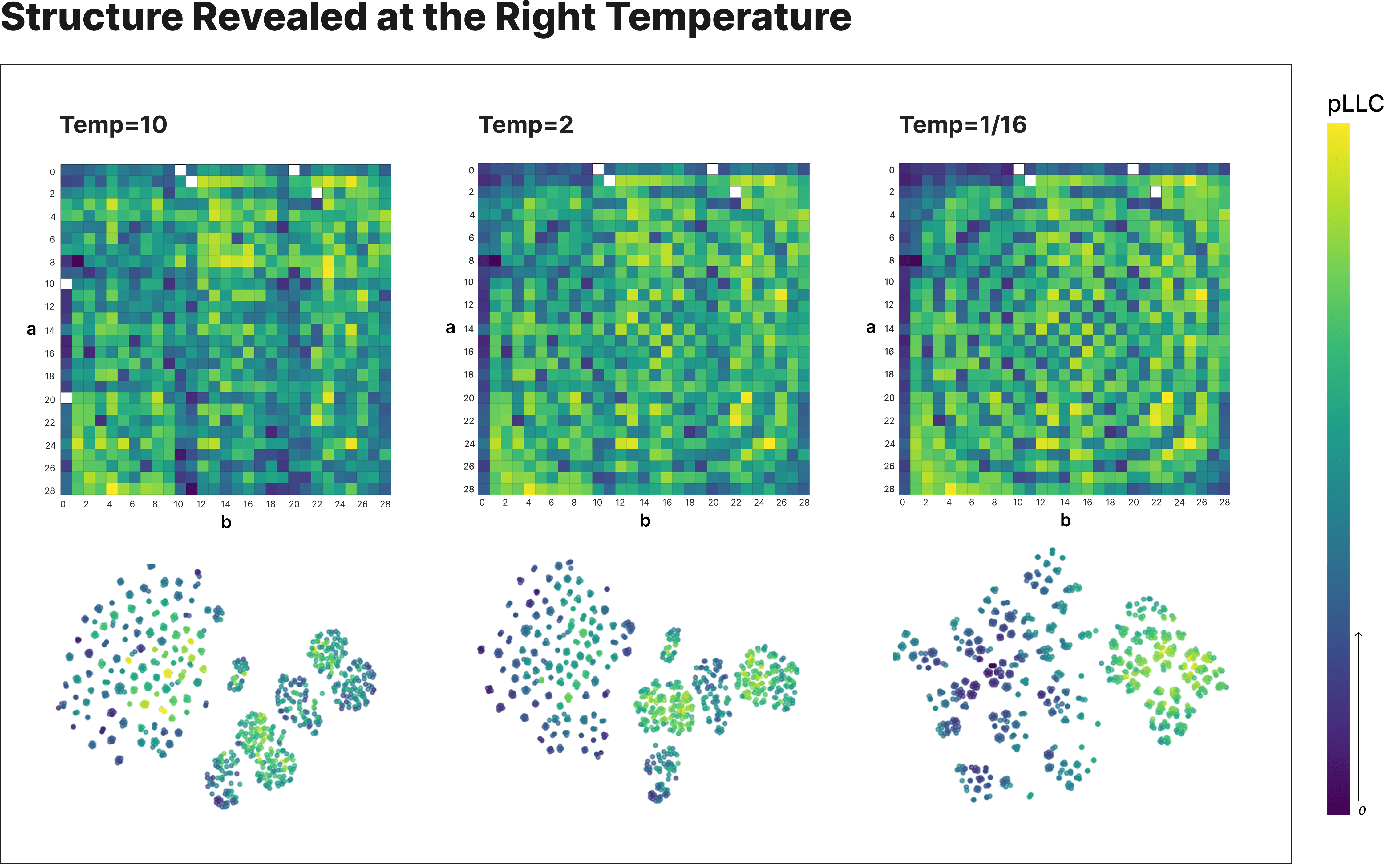We've seen qualitatively different clustering at different temperatures in the MNIST and modular arithmetic experiments. Building on our interpretation from above, we'd like to believe that tuning the temperature allows us to observe meaningfully different structure at different scales - maybe different temperatures can be thought of as revealing progressive levels of 'abstraction'.