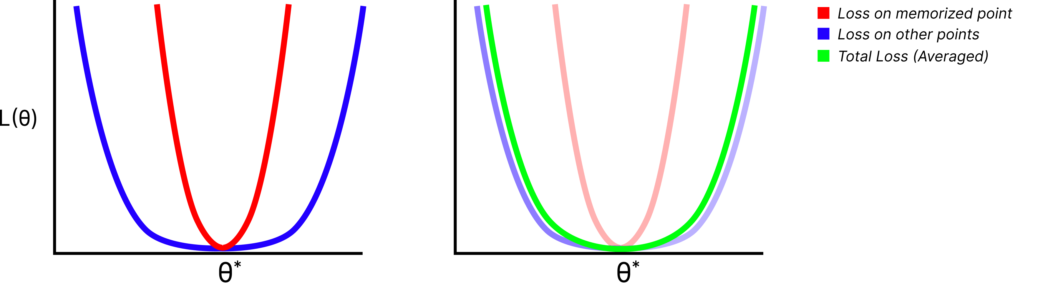 Let's now imagine our two-layer network was spliced into some larger network that computes an unrelated function of the input. In this setup, the loss on our single input will still scale sharply in our memorization direction, but when taking loss over the whole dataset the loss will be dominated by performance on inputs that don't scale sharply along our memorization direction. Specifically, the total loss is the sum of the losses on all points divided by the total number of data points, meaning that the larger our dataset is, the less detectable this difference will be.