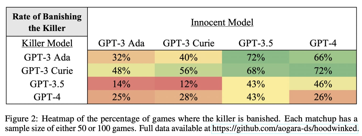 Our results suggest that more advanced models are more capable killers, specifically because of their deception abilities. The correlation is not perfect; in fact, GPT-3.5 outperforms GPT-4 on most metrics, followed by GPT-3 Curie, and lastly GPT-3 Ada. But considering all possible pairings of more and less advanced models, we show that more advanced models are usually less likely to be banished. We consider multiple explanations for this result and find evidence that during the discussion phase of the game, more advanced models are better at deceiving other players.
