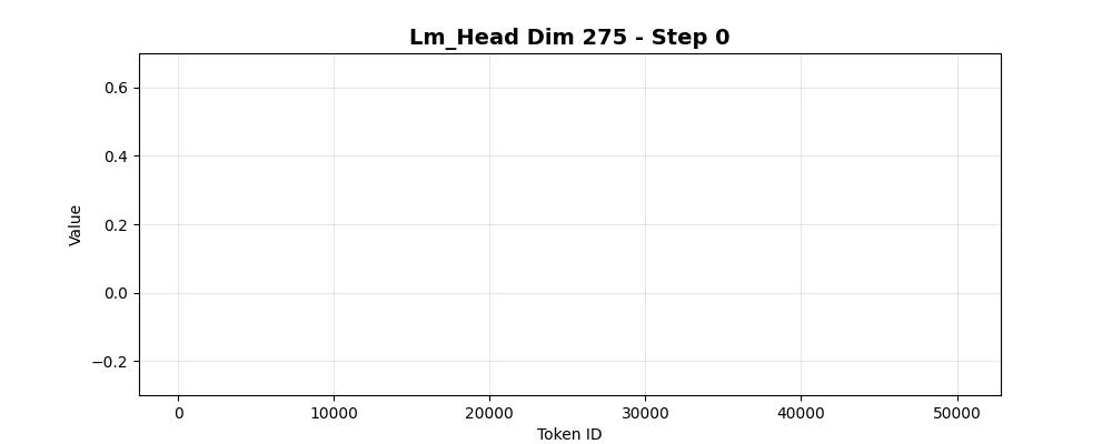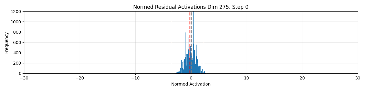 The dimensions in the residual stream are often thought of as an uninterpretable arbitrary rotation of the feature space, since the standard transformer does not have an operation that makes it a privileged basis. Yet, the behavior above for dimension 275 is remarkably distinct. These charts show the evolution of three dynamics over the course of 600 training steps as the model progresses from 10.8 CE loss to 3.6 CE loss: