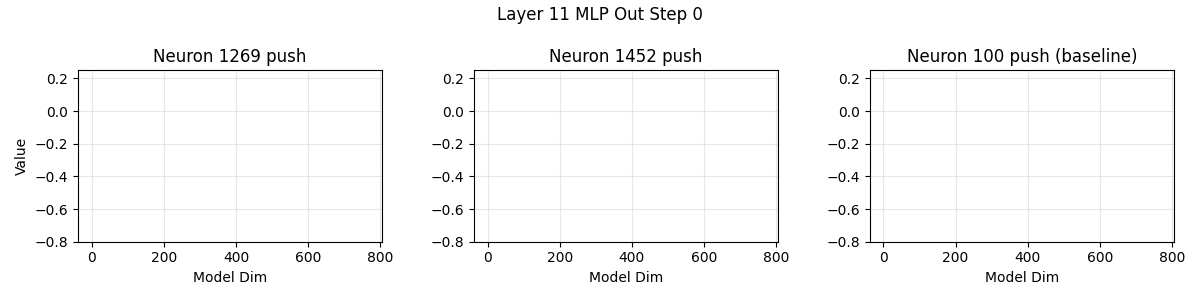The chart below shows what direction MLP neurons 'push' on step 2. Each layer has 3072 neurons. Across 11 layers this gives 33,792 neurons.
