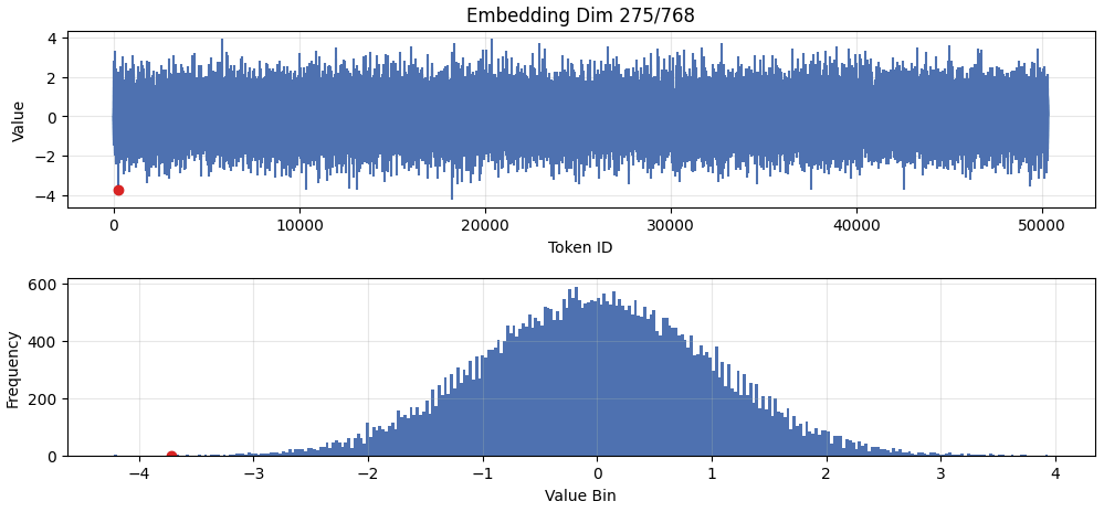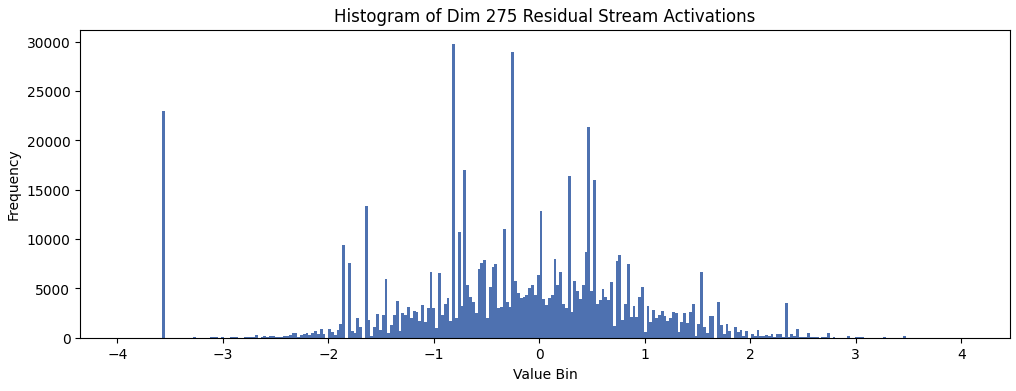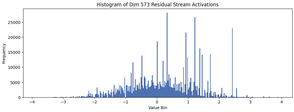 All three dimensions show similar distributions, indicating that the actual 'uncertainty vector' is smeared across three dimensions in the residual stream. Below shows the initial activations induced in dimension 573 by the embedding: